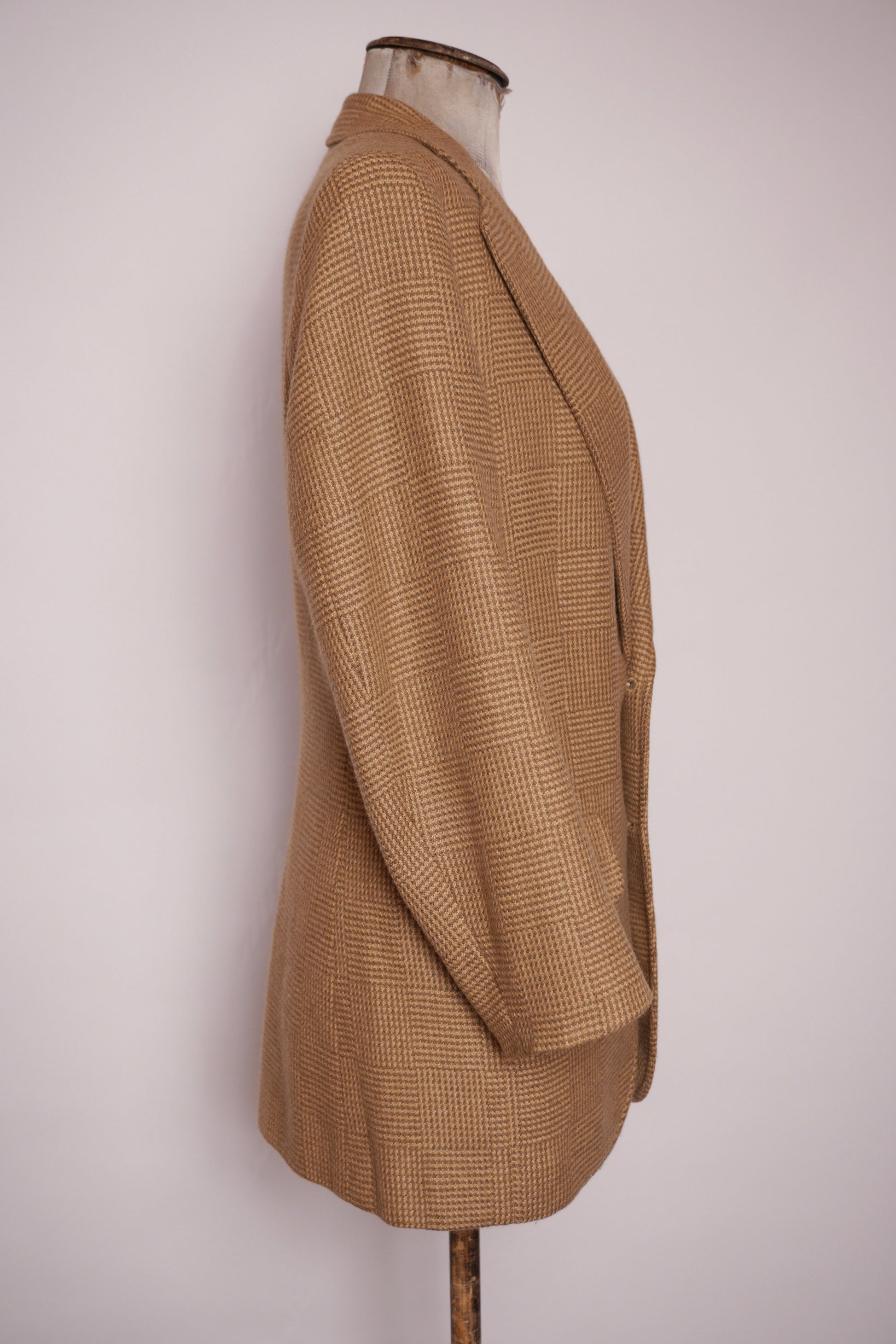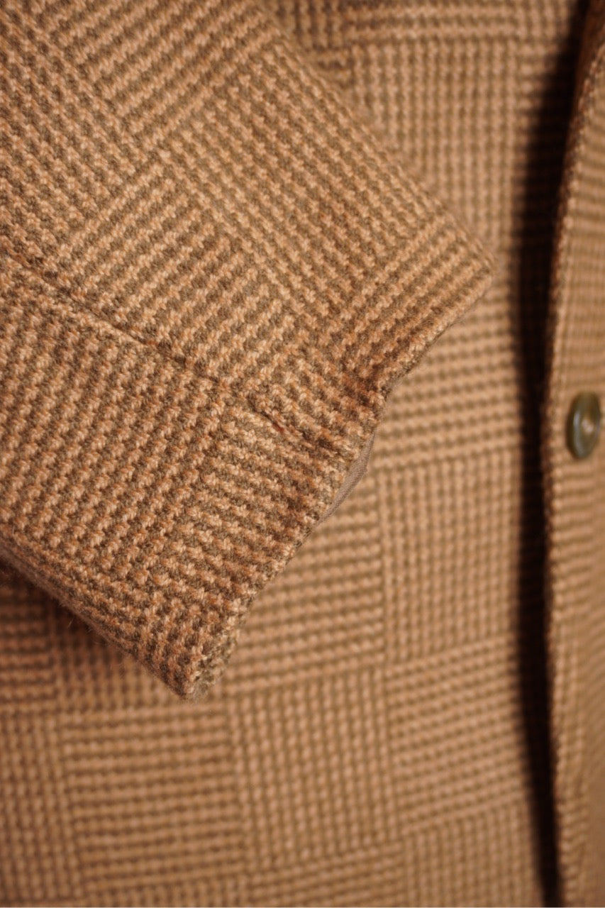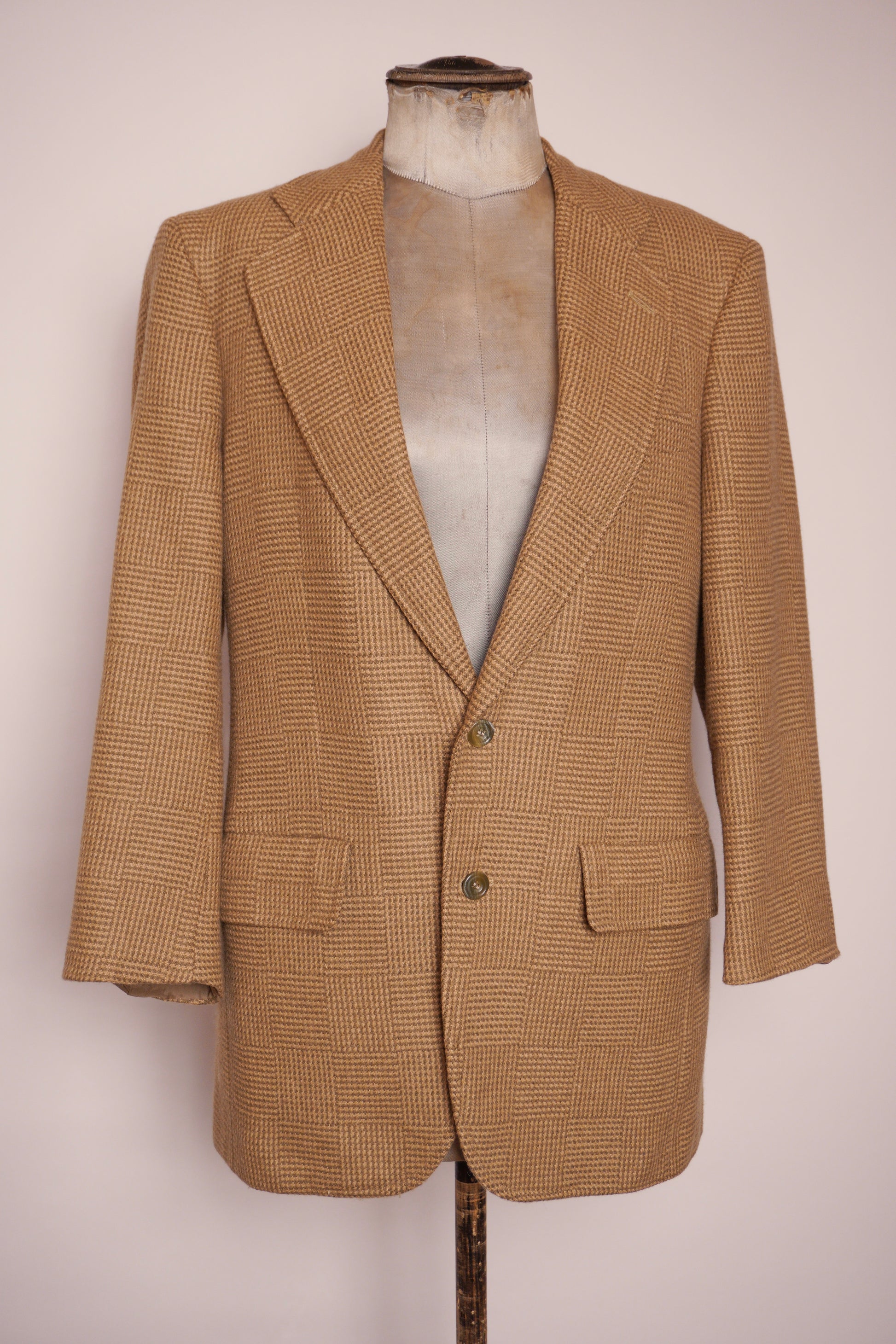 Klassisk herrkavaj i kamelhår från Burberry’s (företaget använde namnet "Burberry’s" fram till slutet av 1990-talet, vilket hjälper till att tidsbestämma plagget). Tyget är ett rutigt mönster i varm beige ton med subtil kontrast. Modellen har breda slag, två knappar framtill och fickor med lock. Insidan är fodrad i brunt.