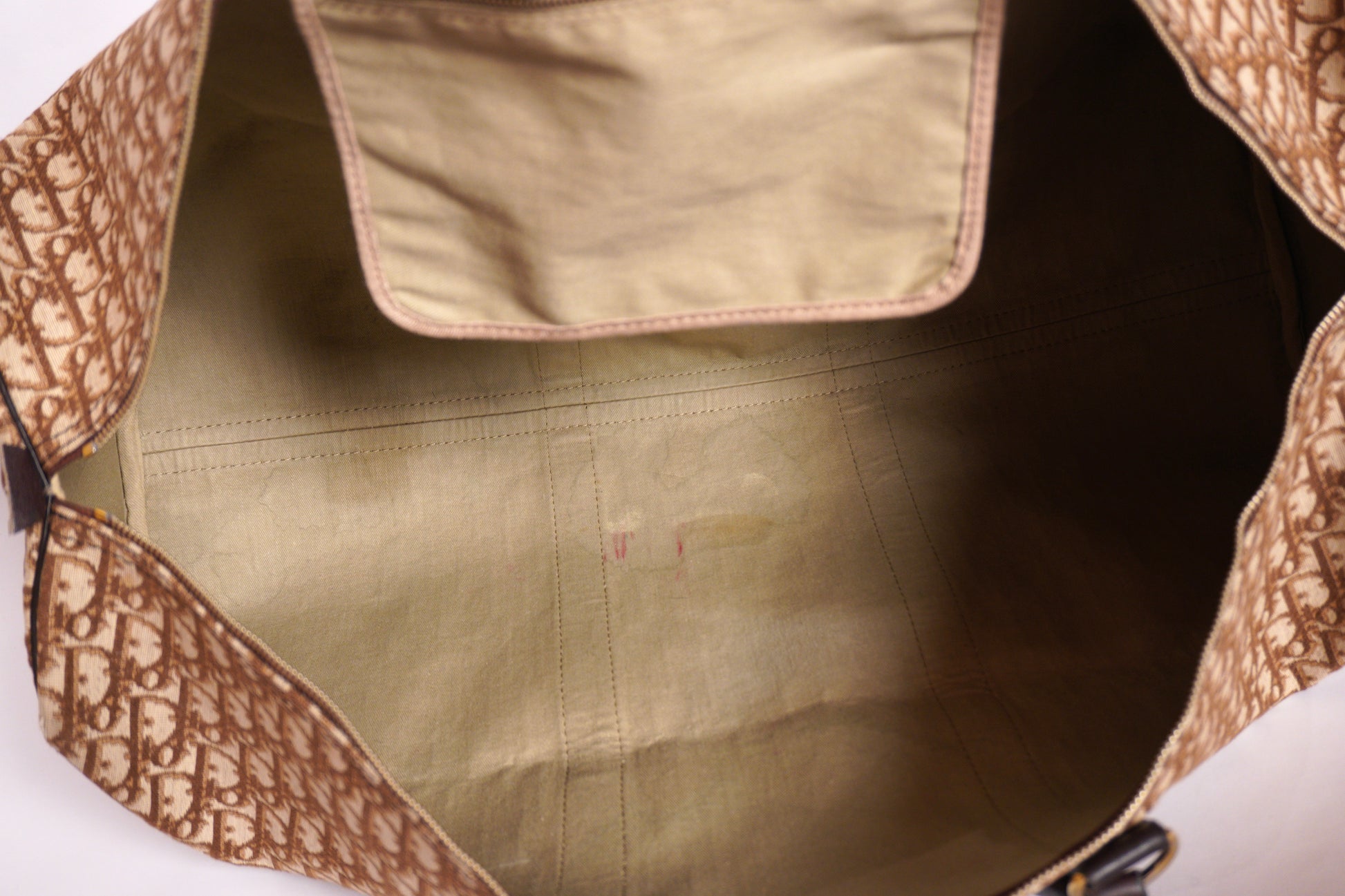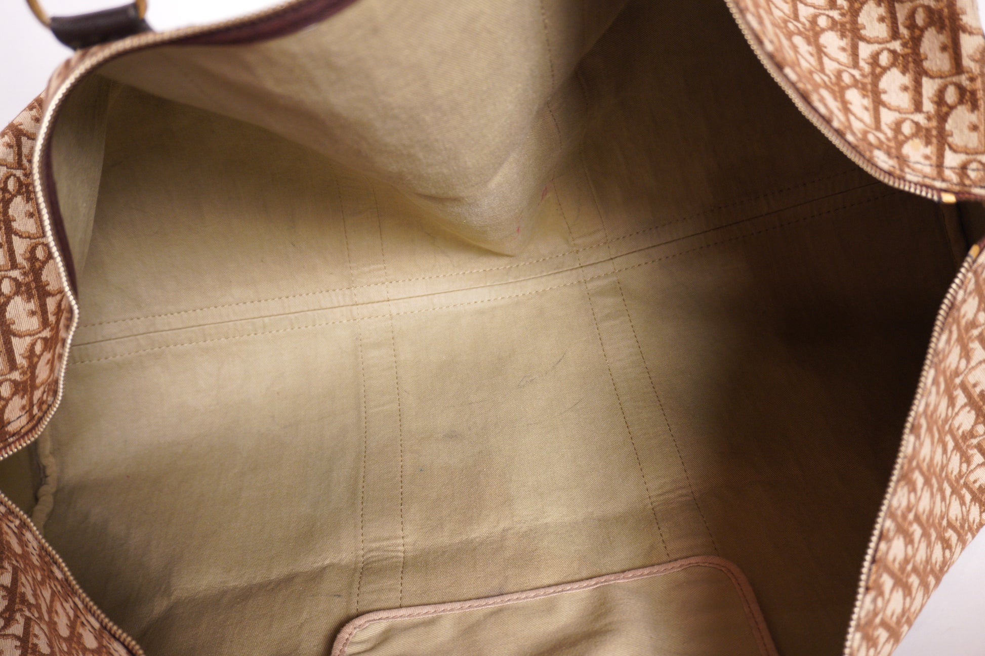 Elegant och rymlig vintageväska från Christian Dior, utförd i husets ikoniska monogramcanvas i varma beige- och bruna toner, kompletterad med mörkbruna läderdetaljer. Väskans generösa format och klassiska mönster gör den till ett tidstypiskt exempel på Diors sofistikerade rese- och weekendväskor från slutet av 1900-talet.