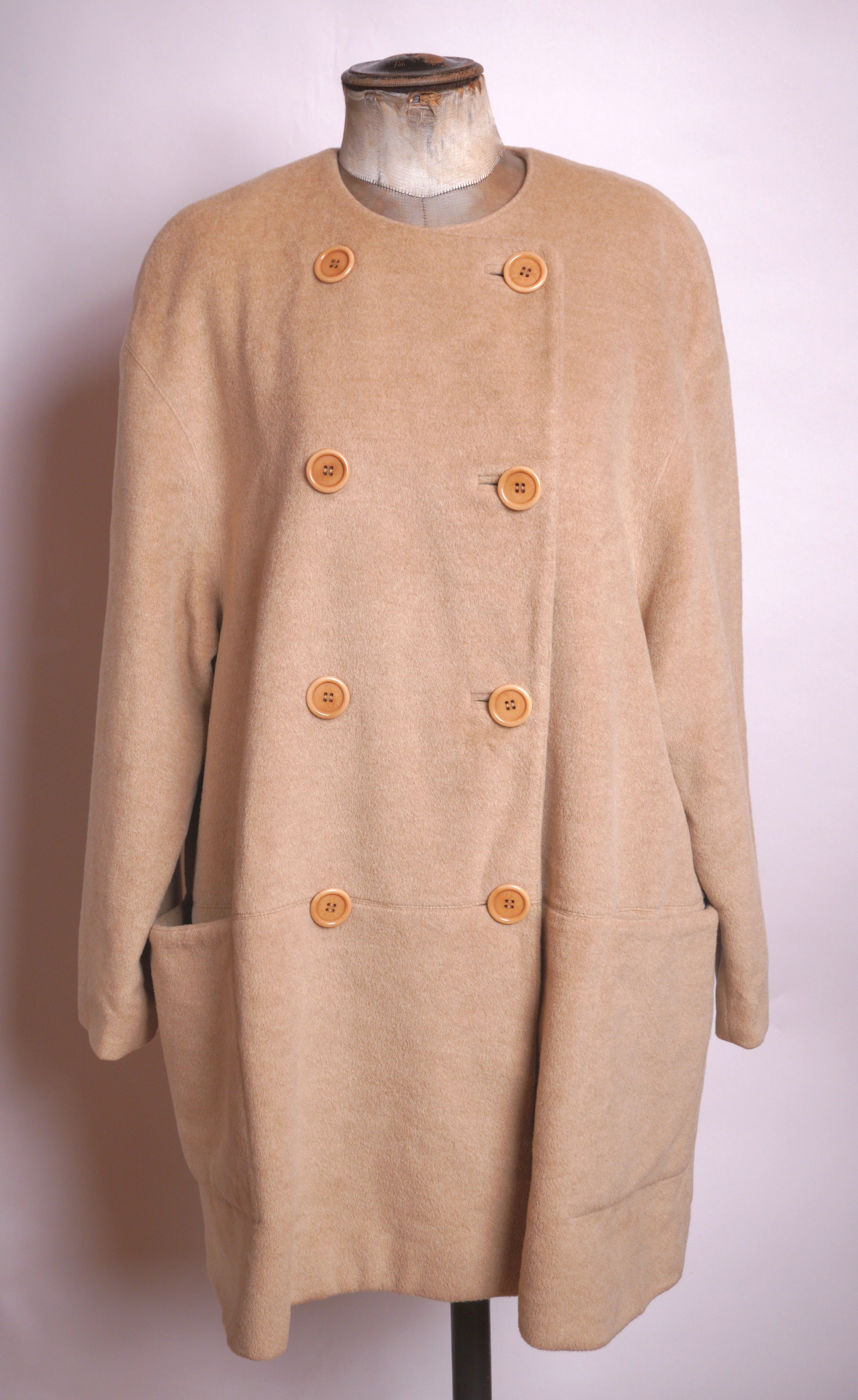 En tidlös och elegant kappa från Escada, tillverkad i en exklusiv ull- och kashmirblandning som ger en mjuk och lyxig känsla. Kappan har en minimalistisk, rak silhuett med generös passform och en vacker struktur i tyget. Den dubbelknäppta fronten pryds av sex stora, matchande knappar som ger ett stilrent uttryck. De djupa fickorna framtill adderar både funktion och en avslappnad balans till det klassiskt feminina snittet.