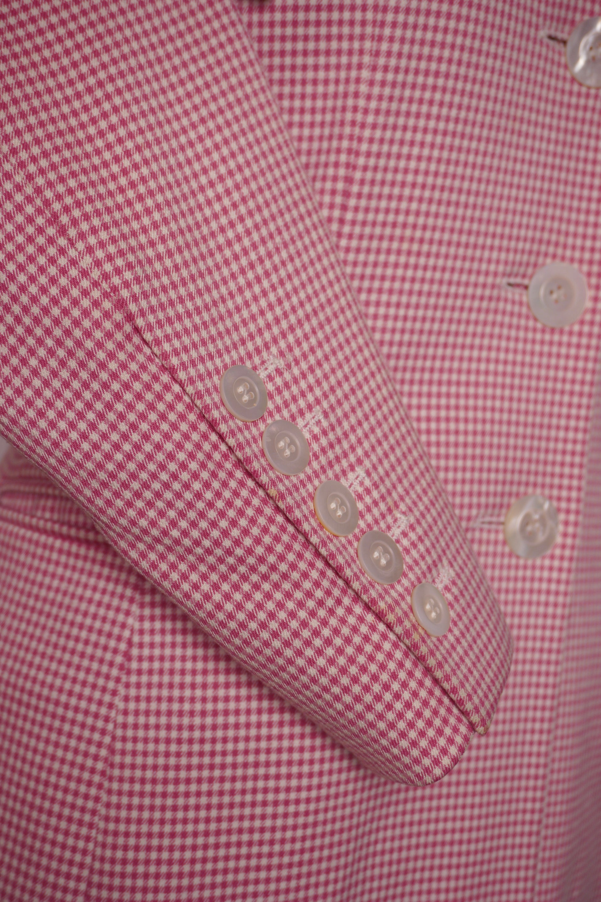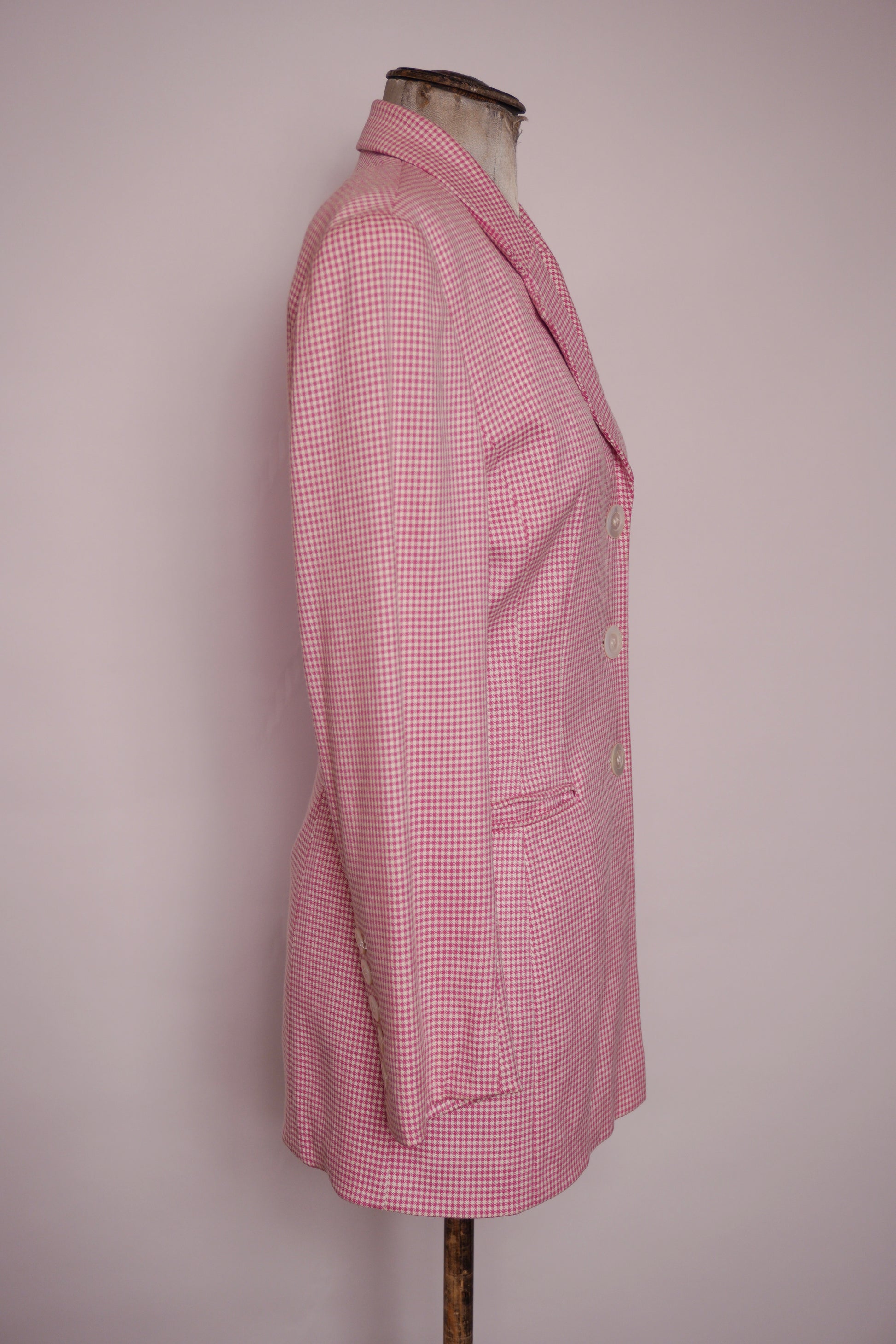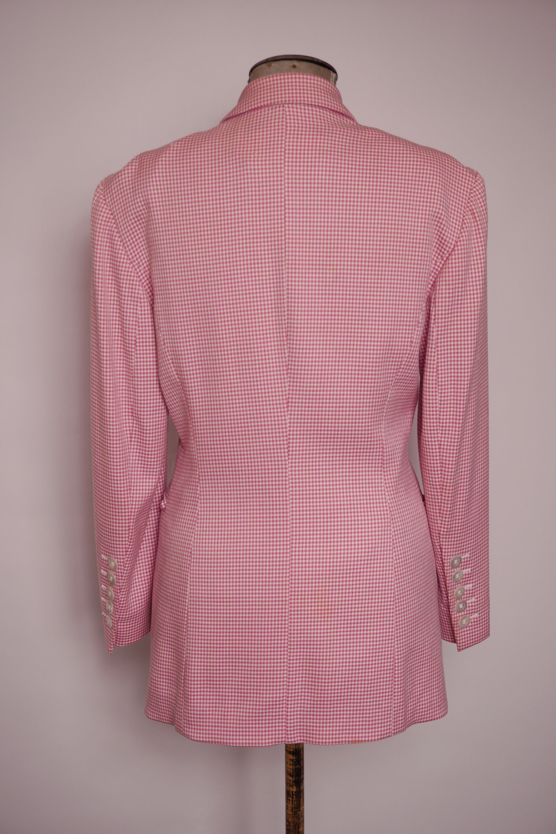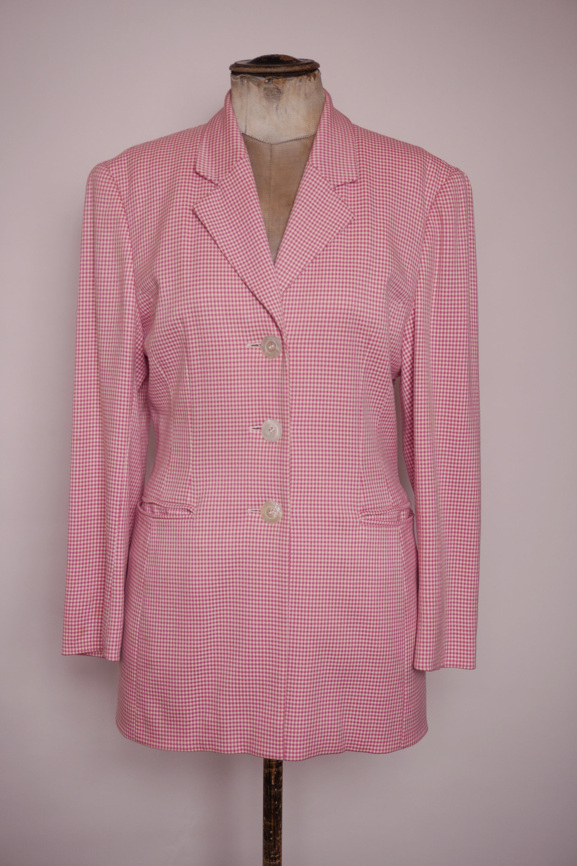En exklusiv kavaj från Escada, designad av Margaretha Ley, där klassiskt skrädderi möter 80/90-talets lyxiga estetik. Den rosa hundtandsrutan ger en lekfull men sofistikerad känsla, medan den långa silhuetten skapar ett elegant uttryck. Fodret pryds av den ikoniska Escada-kedjan i guld, en detalj som vittnar om märkets påkostade hantverk och tidstypiska extravagans.