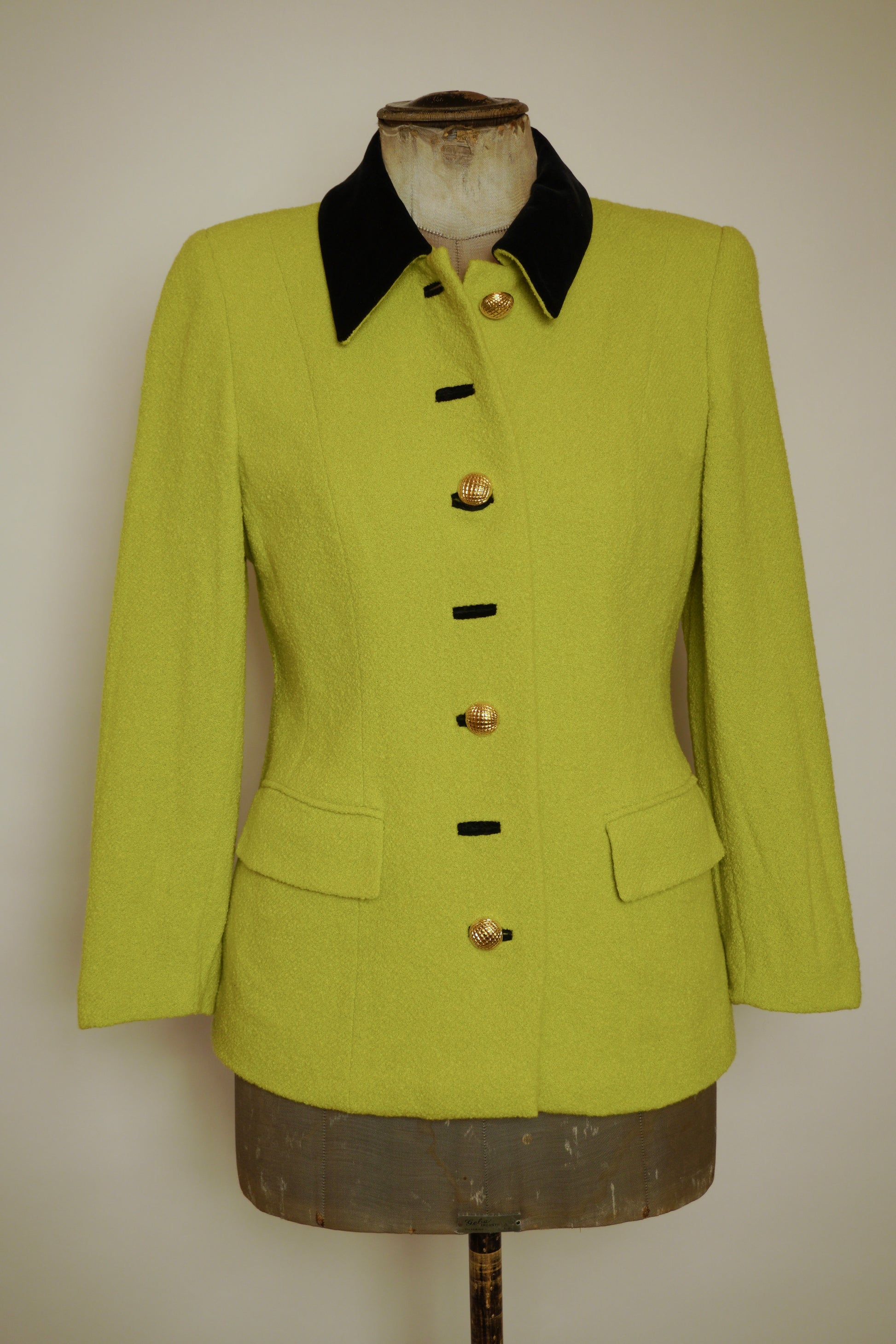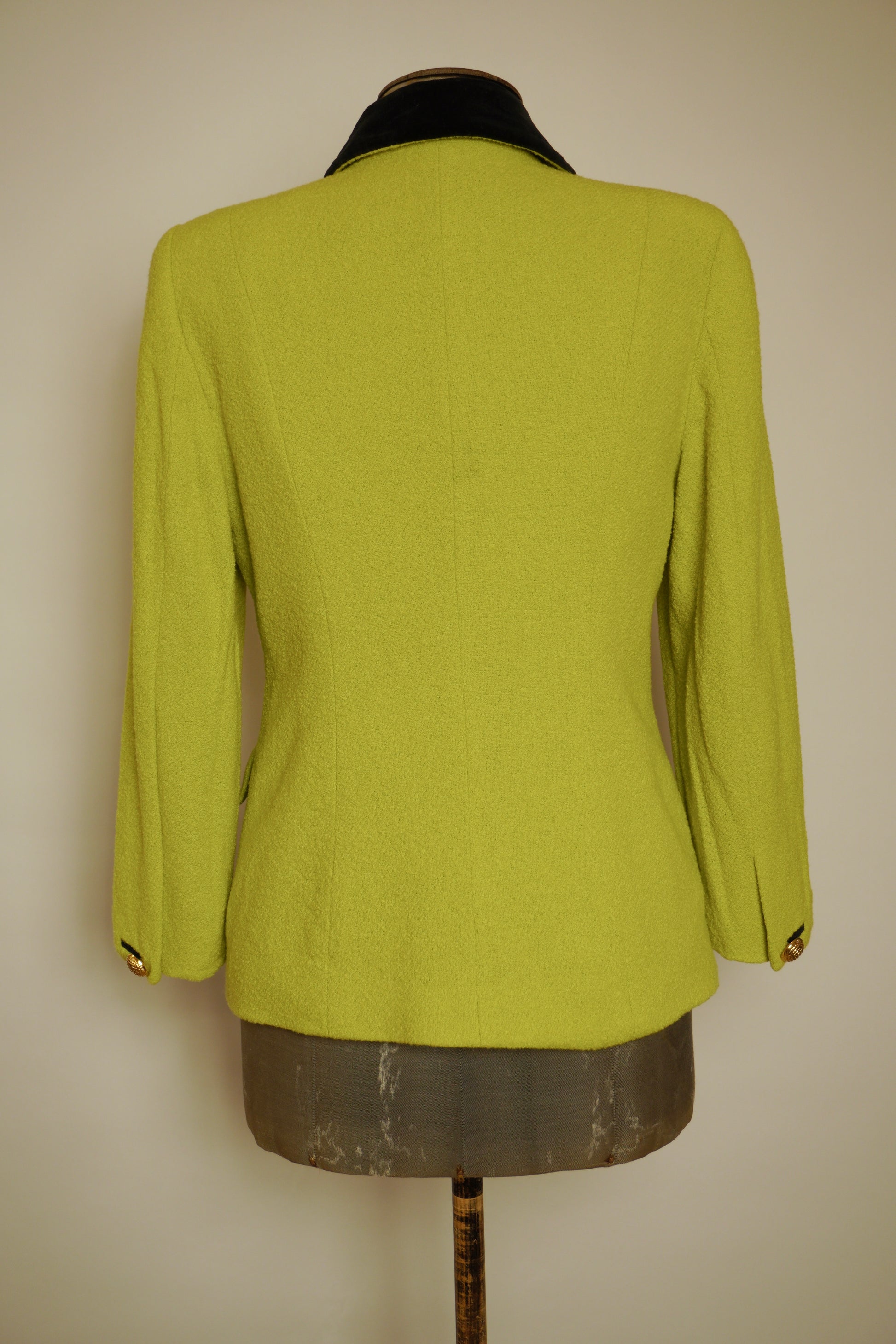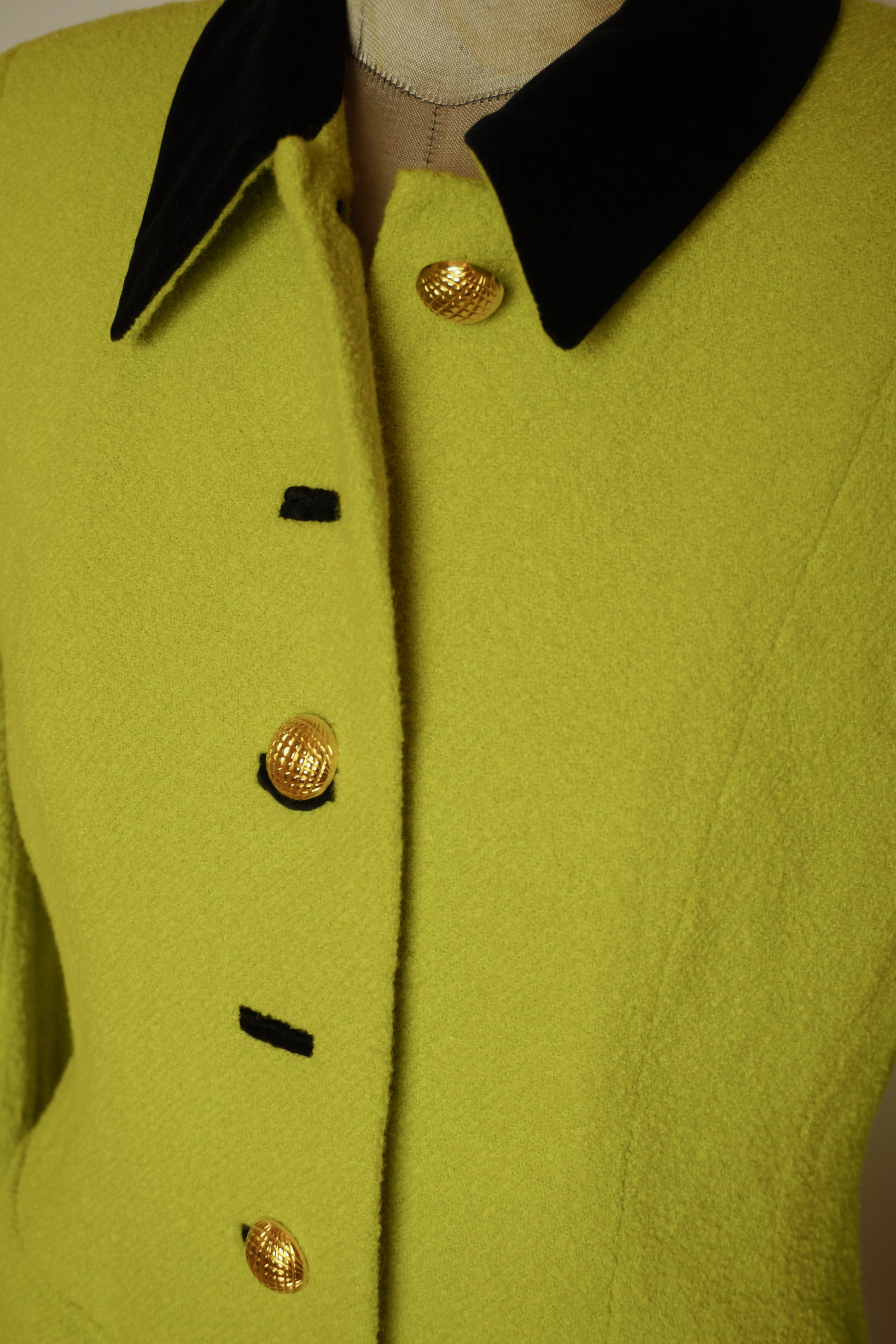 En fantastisk vintagekavaj från Escada som fångar ögat direkt med sin intensiva limegröna färg. Tillverkad i 85% ull med en härlig struktur som både känns lyxig och varm. Den svarta sammetskragen ger en sofistikerad kontrast och för tankarna till 80/90-talets glamorösa power dressing.