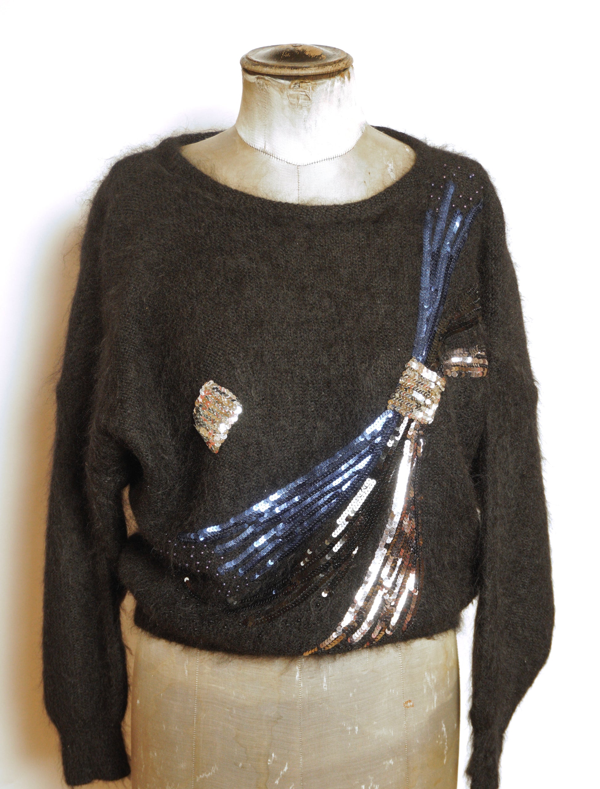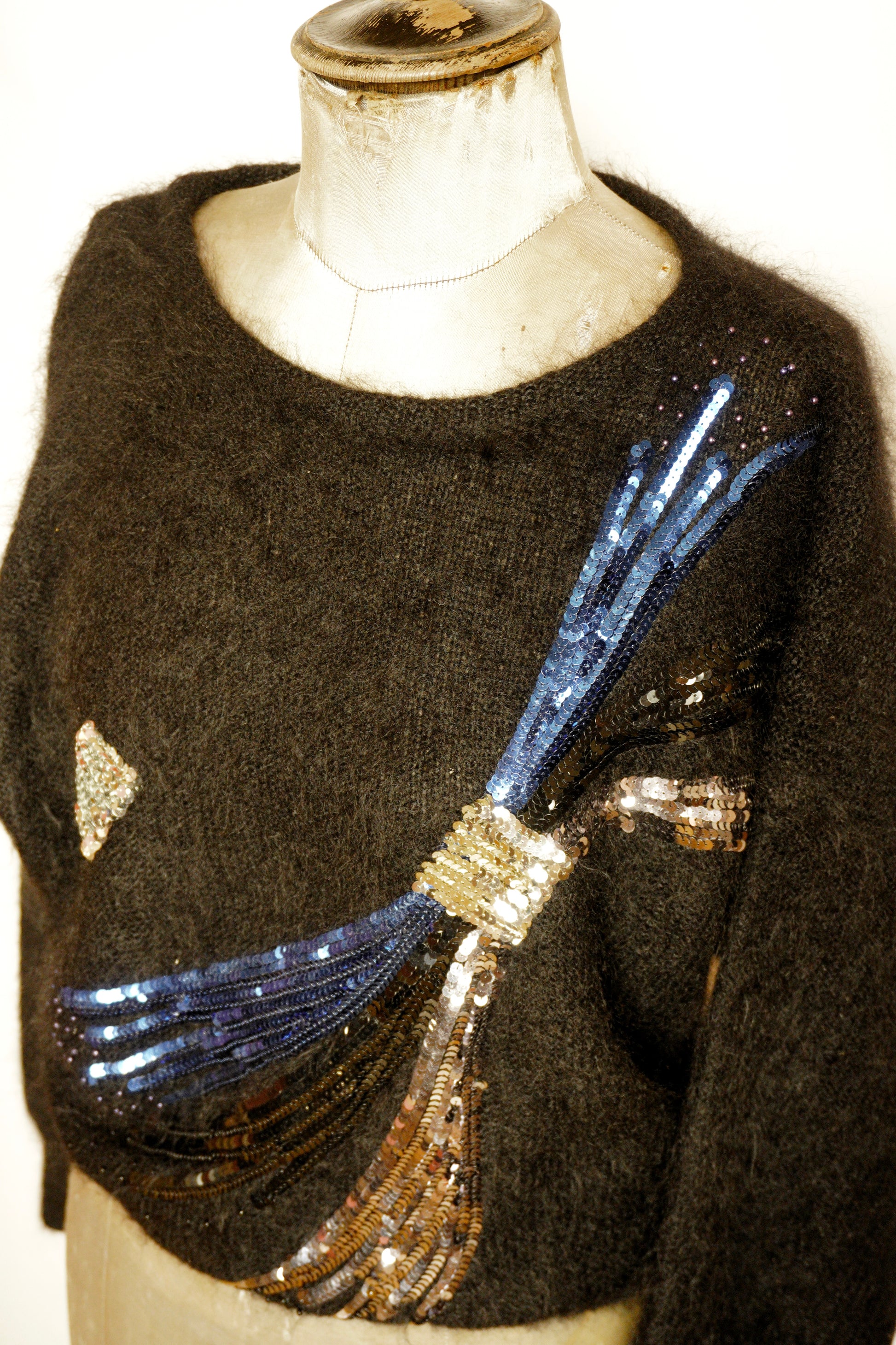 En lyxig och exklusiv tröja från Escada, tillverkad i ett mjukt och fluffigt mohairgarn som ger en varm och behaglig känsla. Denna tröja är dekorerad med en imponerande paljettbrodering på framsidan, där glittrande detaljer i silver och blått bildar ett dramatiskt och konstnärligt mönster.