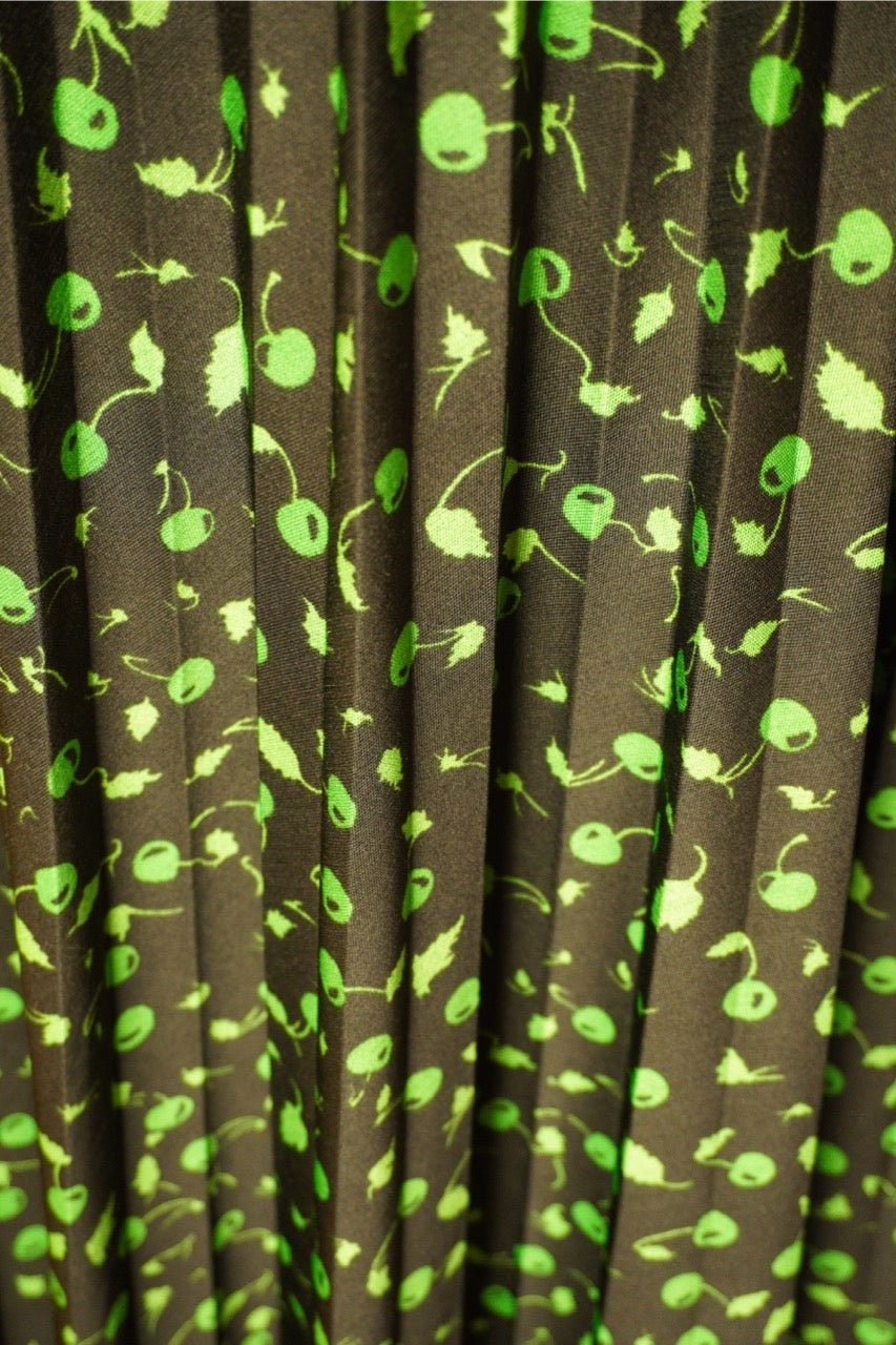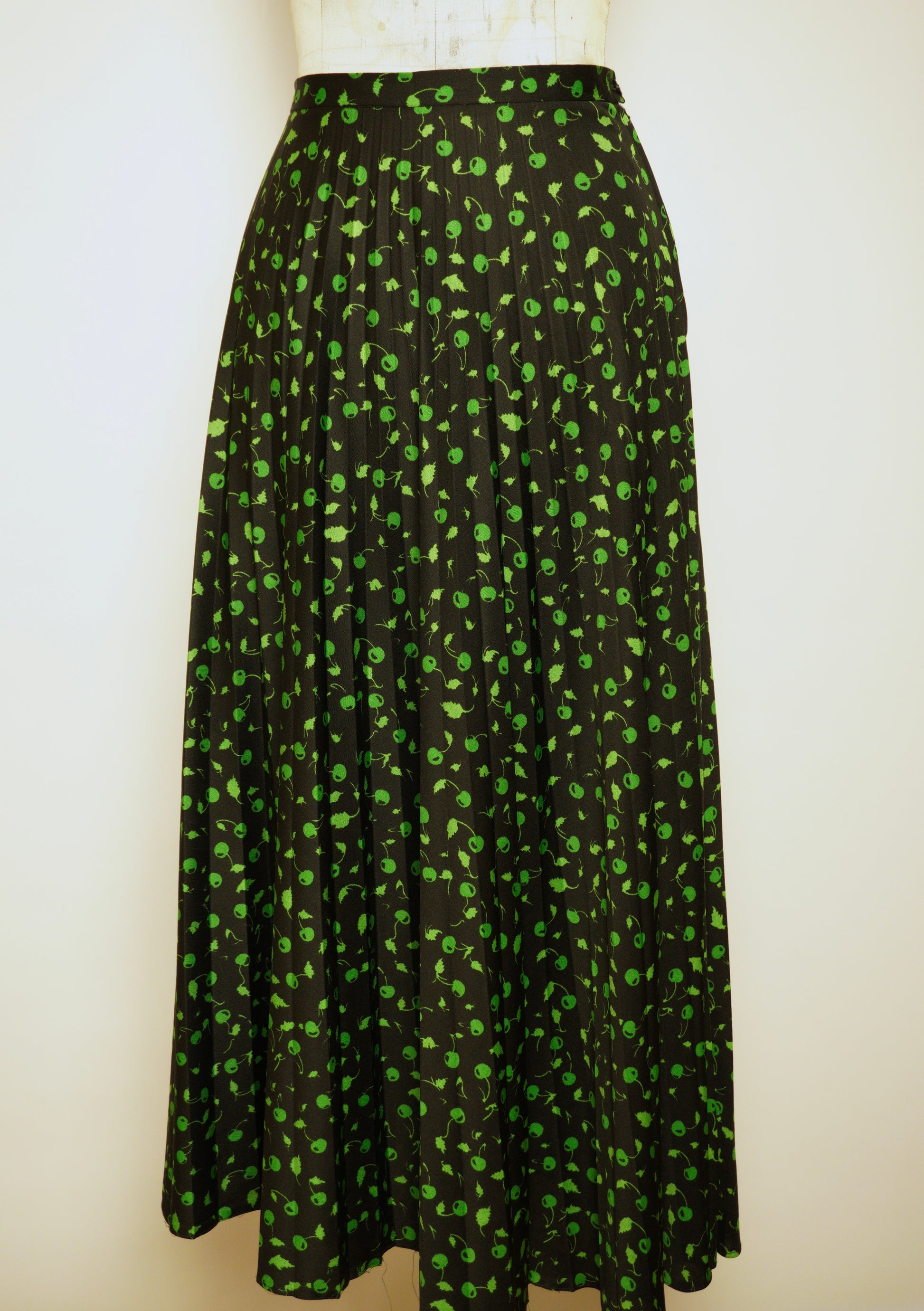 En underbar vintagekjol som kombinerar klassisk elegans med lekfullt uttryck. Den svarta basen pryds av små gröna äpplen som skapar liv och en charmig, unik känsla i tyget. De fina plisseringarna ger kjolen ett vackert fall och en mjuk rörelse när man går.