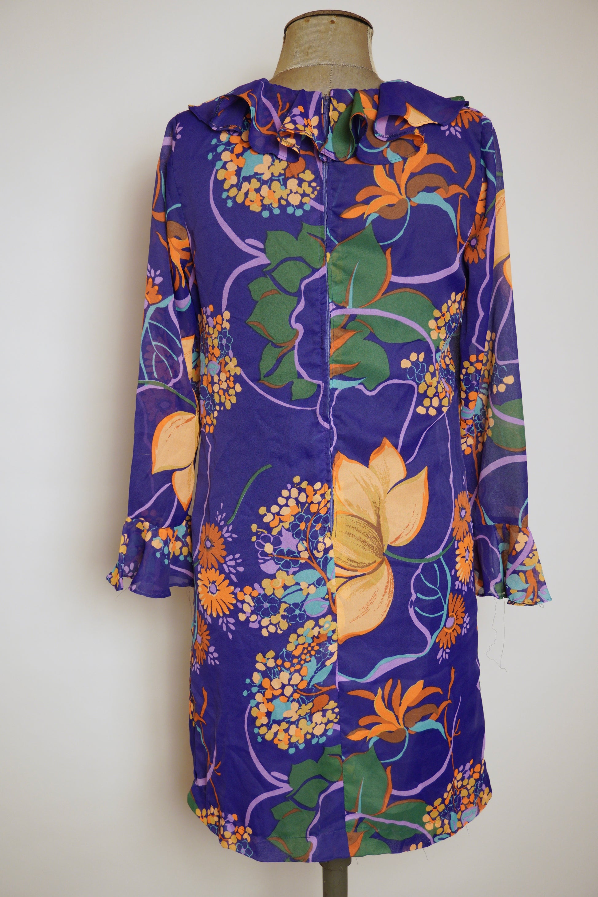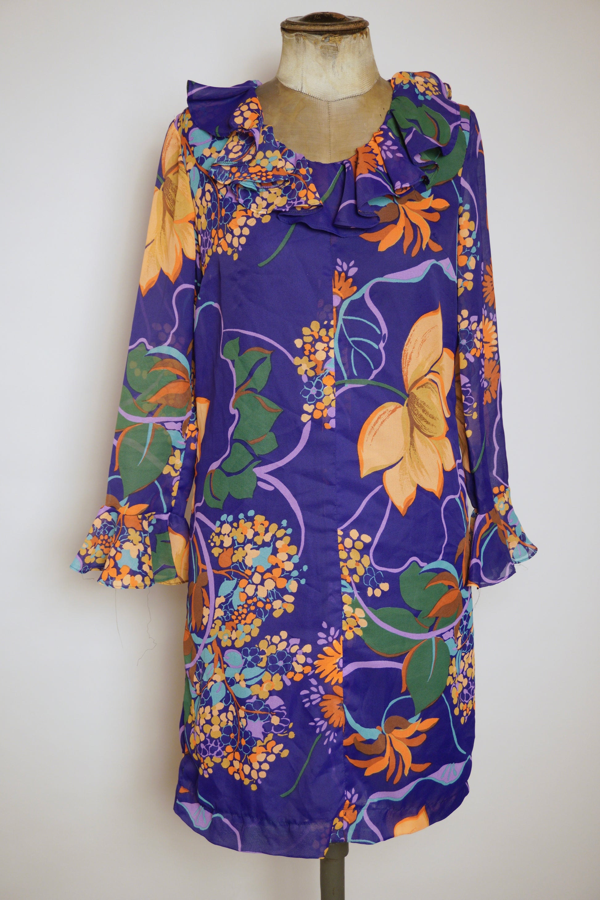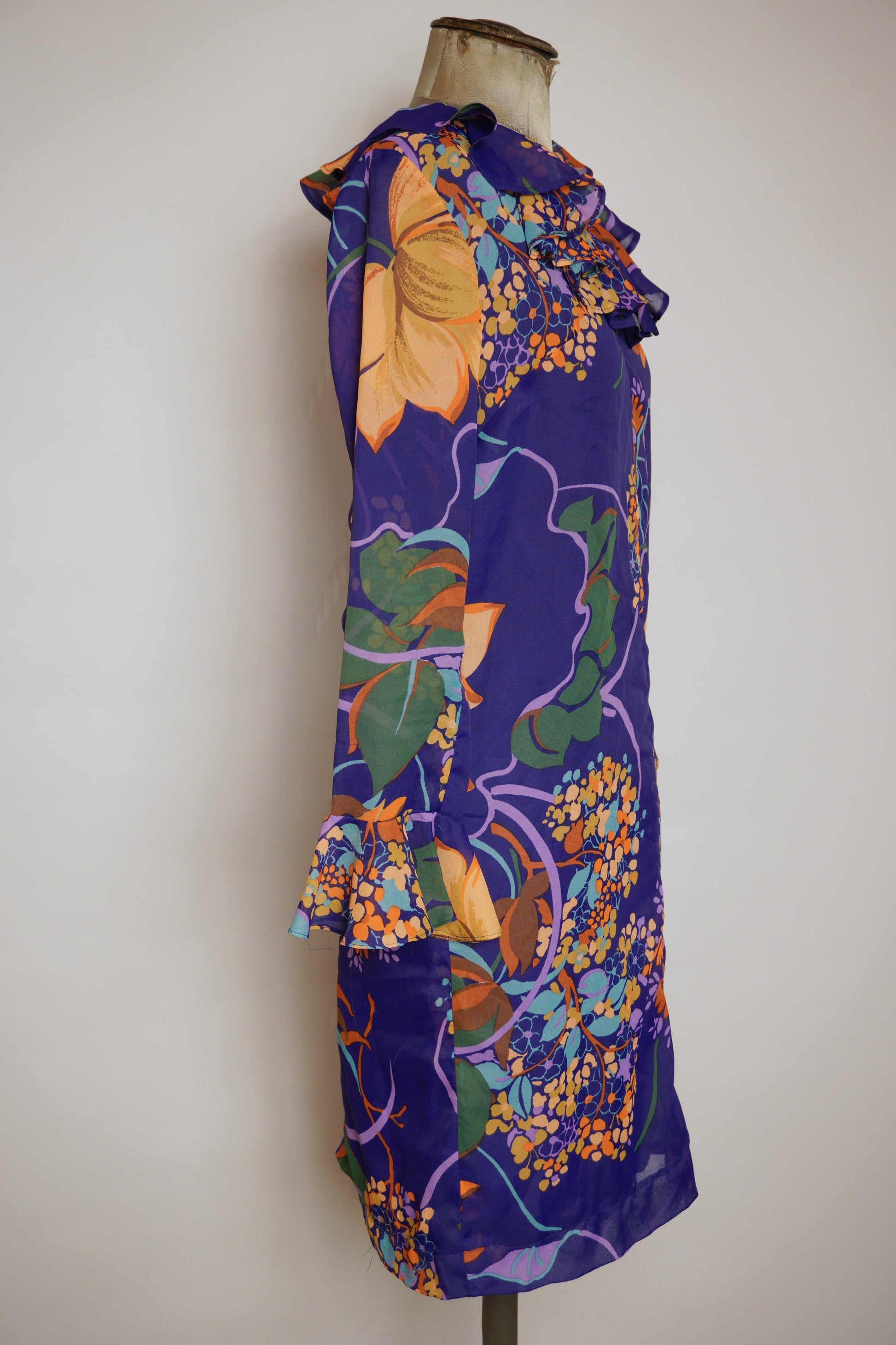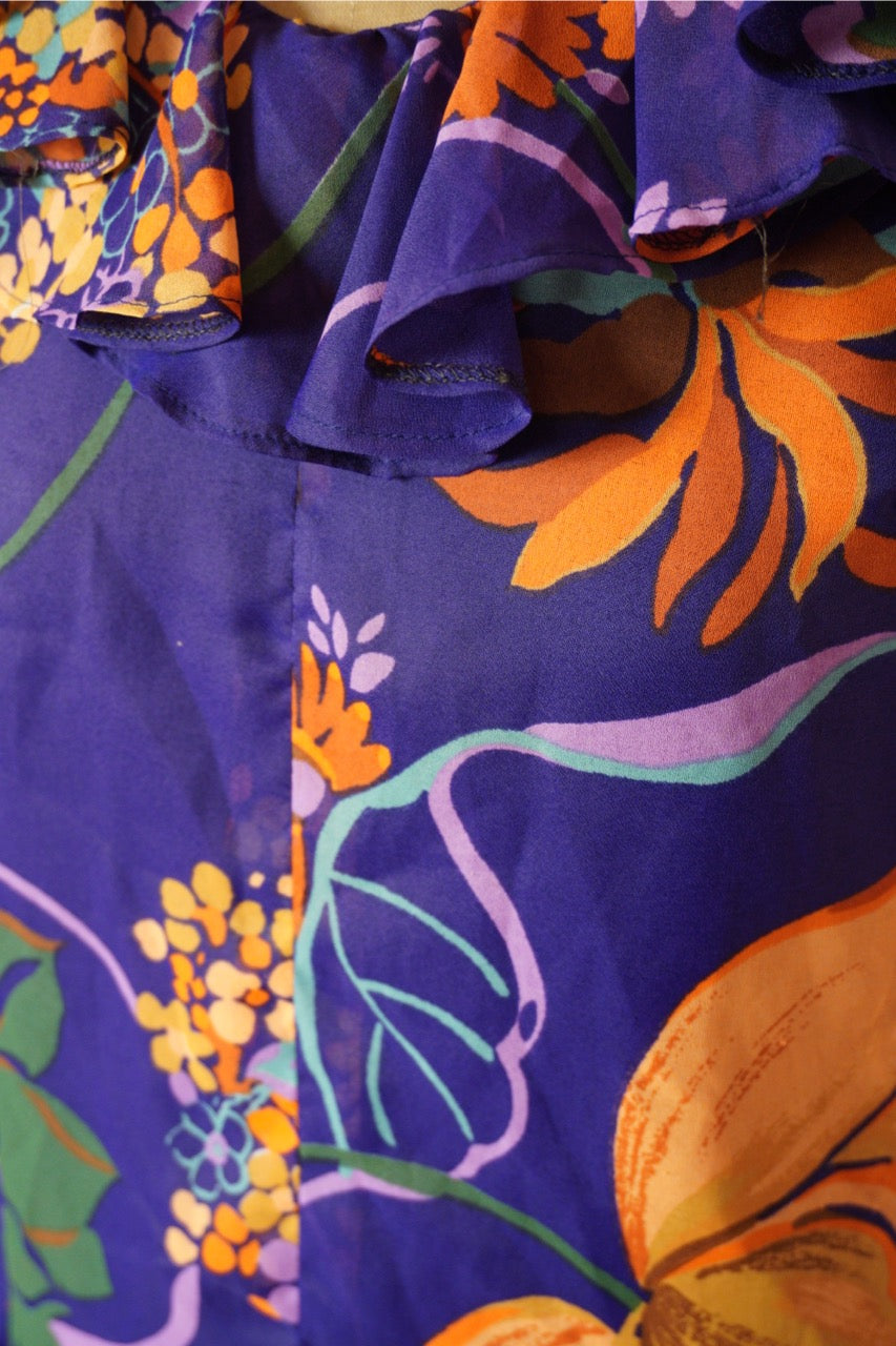 Den här klänningen från svenska Matinette är ett färgsprakande exempel på 1970-talets modescen, där starka mönster och uttrycksfull design stod i fokus. Med sin djupa lila botten och stora blommor i orange, gult och grönt blir den en riktig blickfångare. Volangdetaljer vid halsringning och ärmslut förstärker den lekfulla känslan, samtidigt som den luftiga kvalitén gör den bekväm att bära. Matinette var ett svenskt märke som ofta arbetade med trendiga och lättburna plagg – och den här klänningen är inget undantag. Perfekt både för den som samlar på vintage eller vill addera ett unikt, färgstarkt plagg till garderoben.