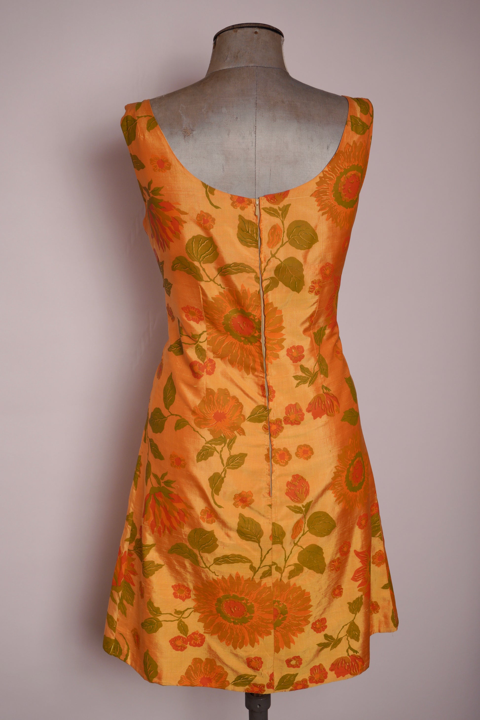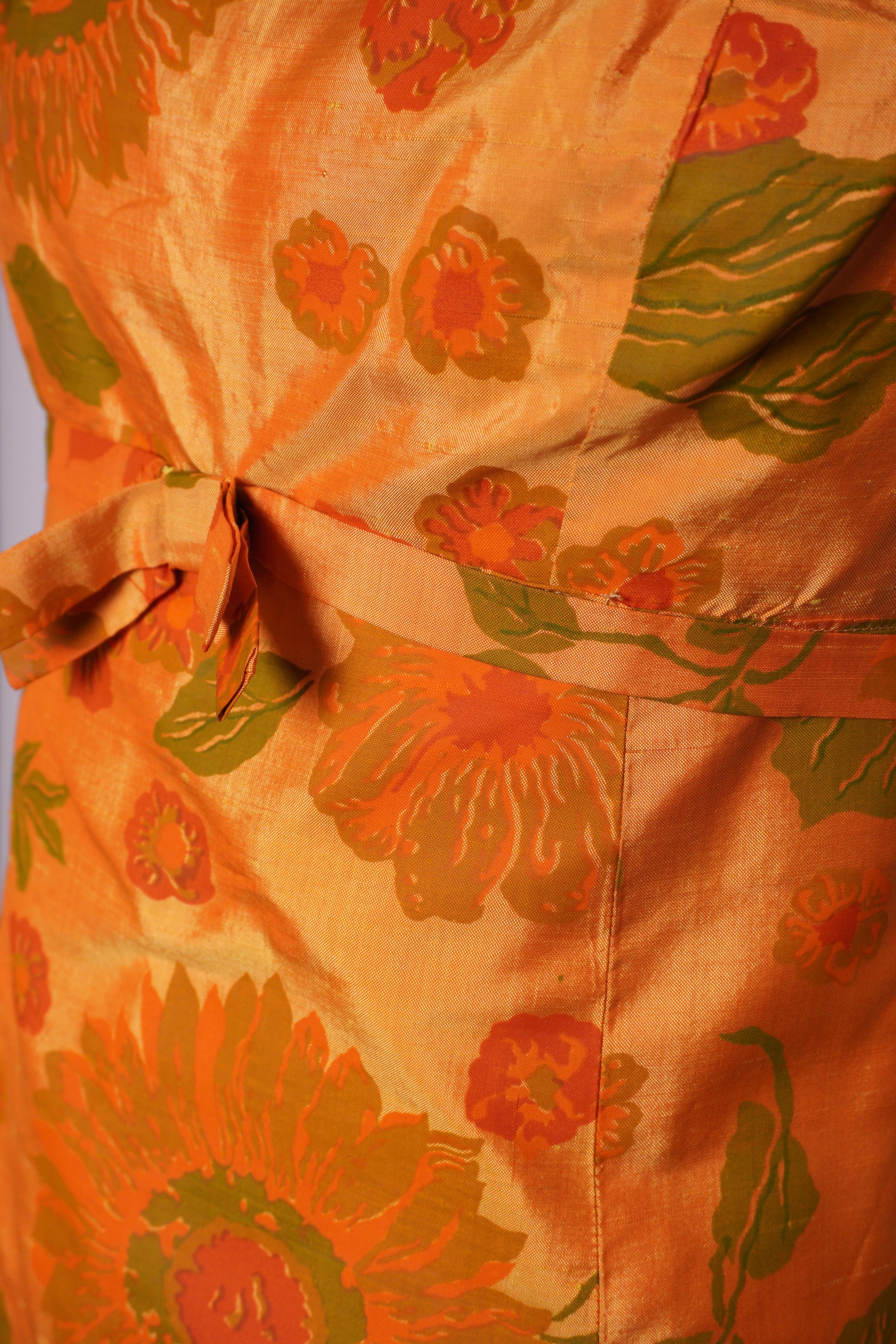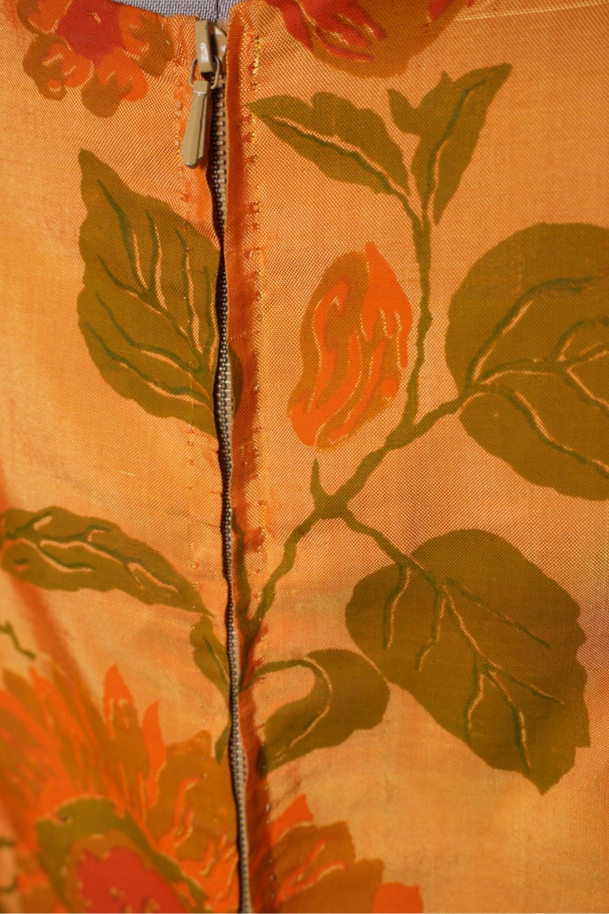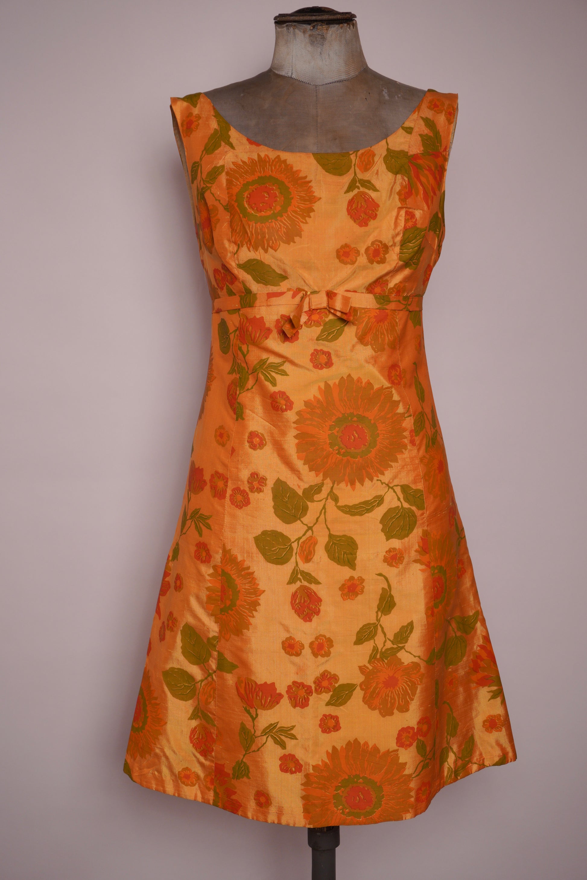 Charmig klänning från 1960-talet i en fantastisk solgul ton med livfullt blommönster i orange och grönt. Den är skuren i en klassisk A-linjeform som ger en tidstypisk siluett, och dekorerad med en söt rosett i midjan för en feminin detalj. Tyget har en vacker lyster som framhäver blommornas mönster och ger klänningen en festlig känsla. Ett underbart vintageplagg som fångar 60-talets lekfulla elegans.