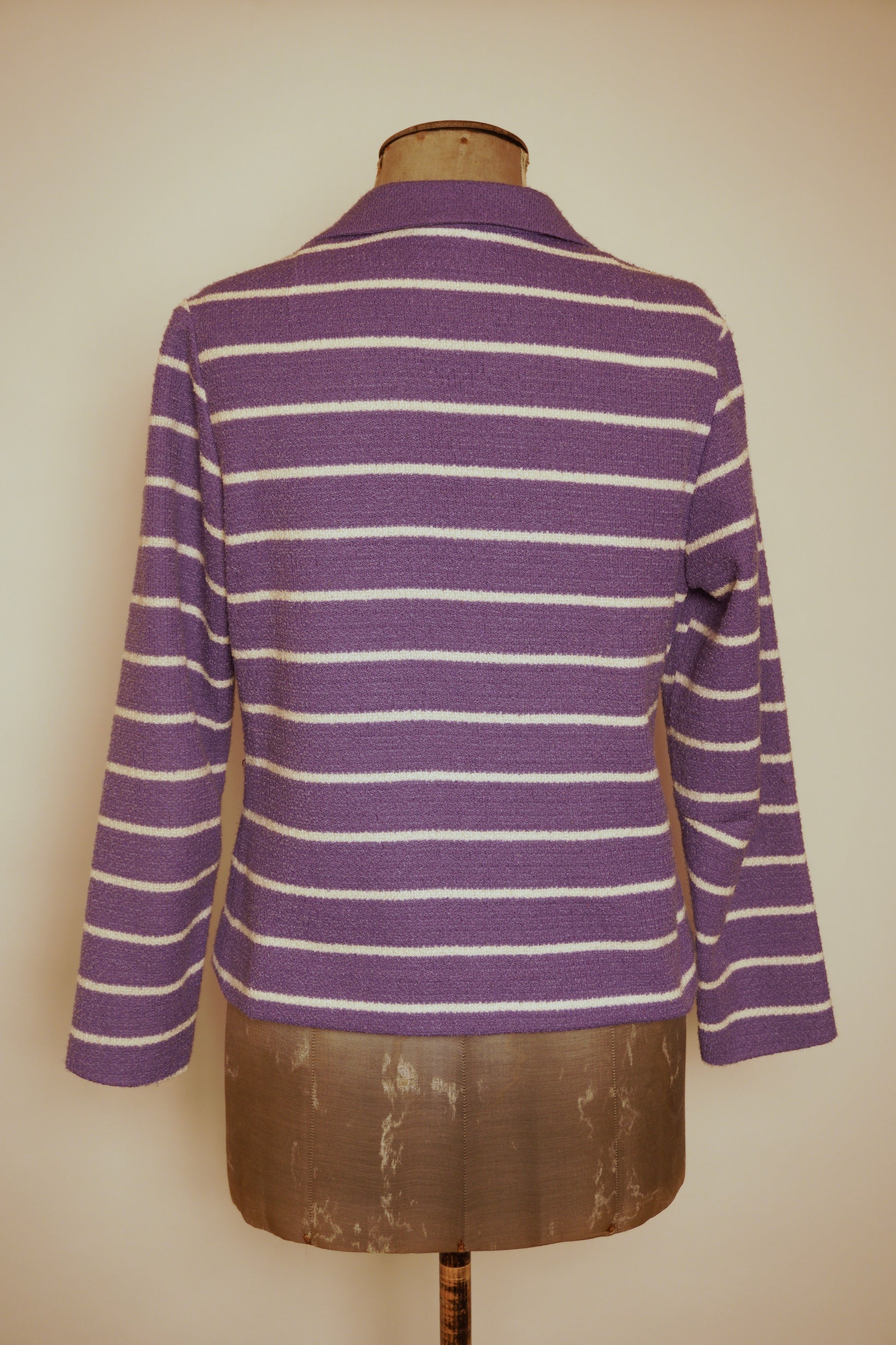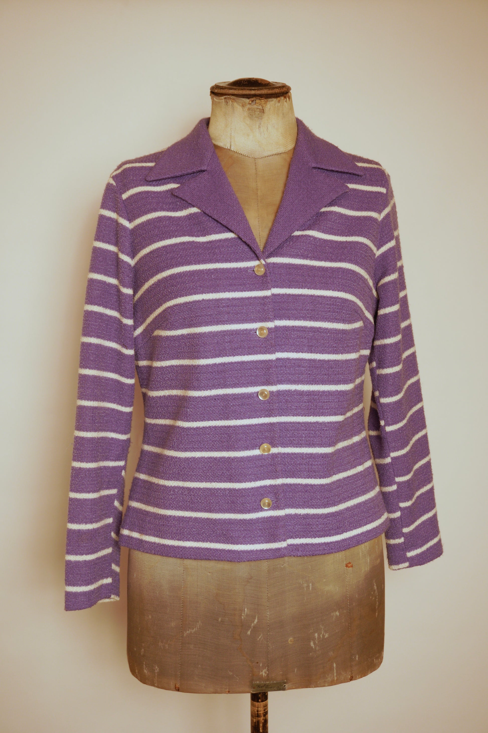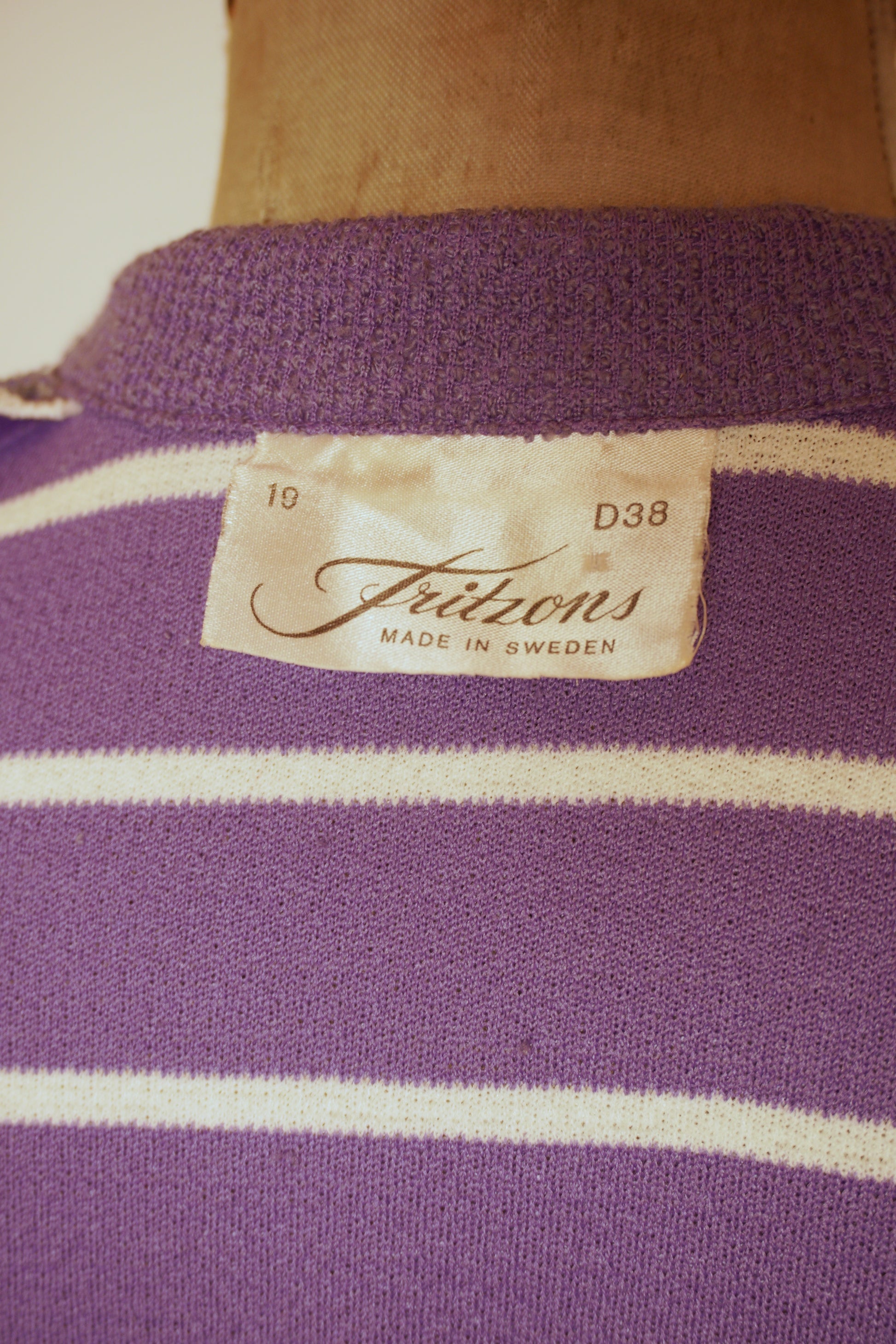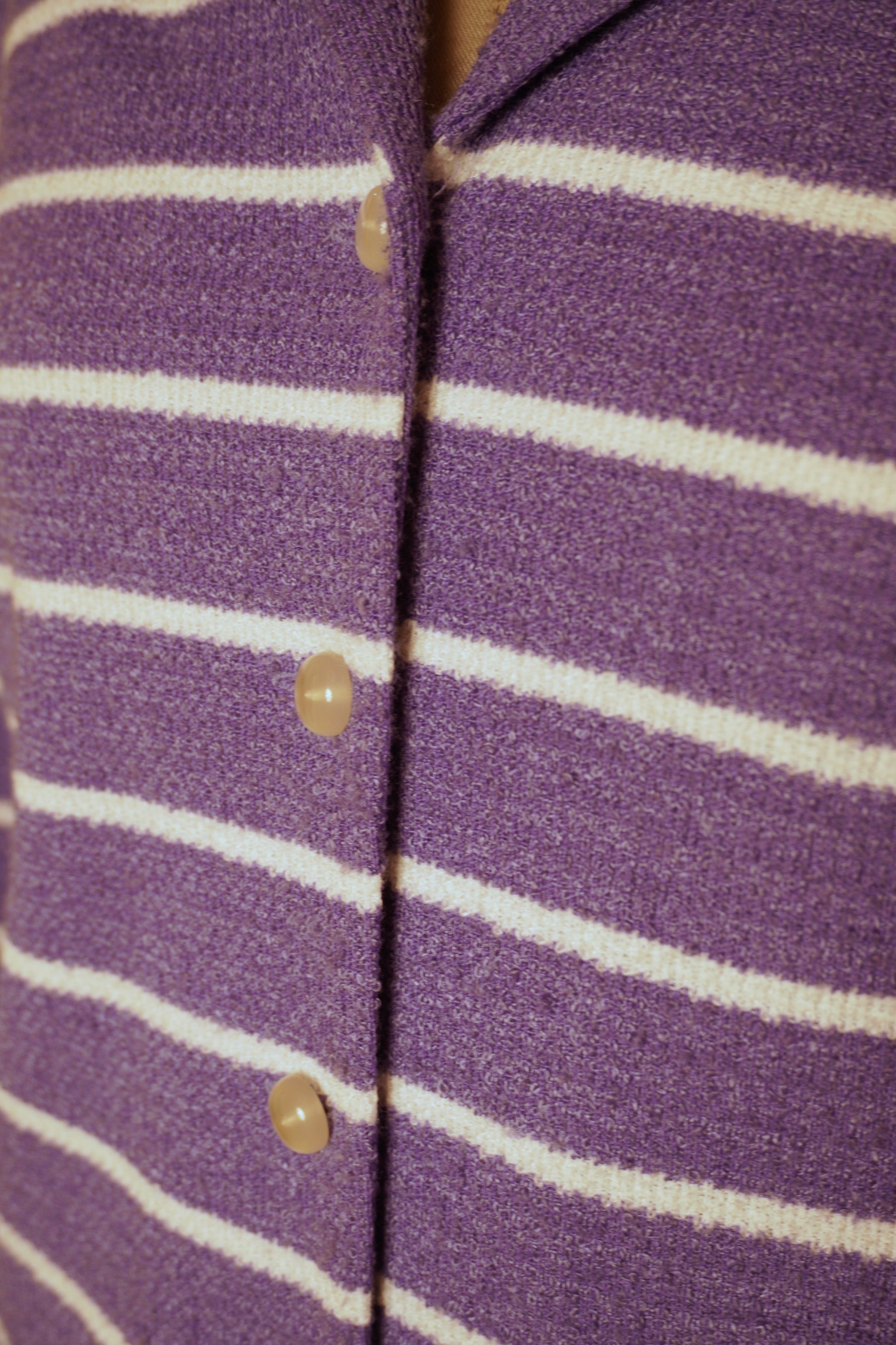 Lila kofta med vita ränder från svenska märket Fritzons. Tillverkad i Sverige. Klassisk modell med krage, lång ärm och pärlemorskimrande knappar framtill. Mjuk och lättstickad kvalitet, perfekt att bära både uppknäppt och stängd.
