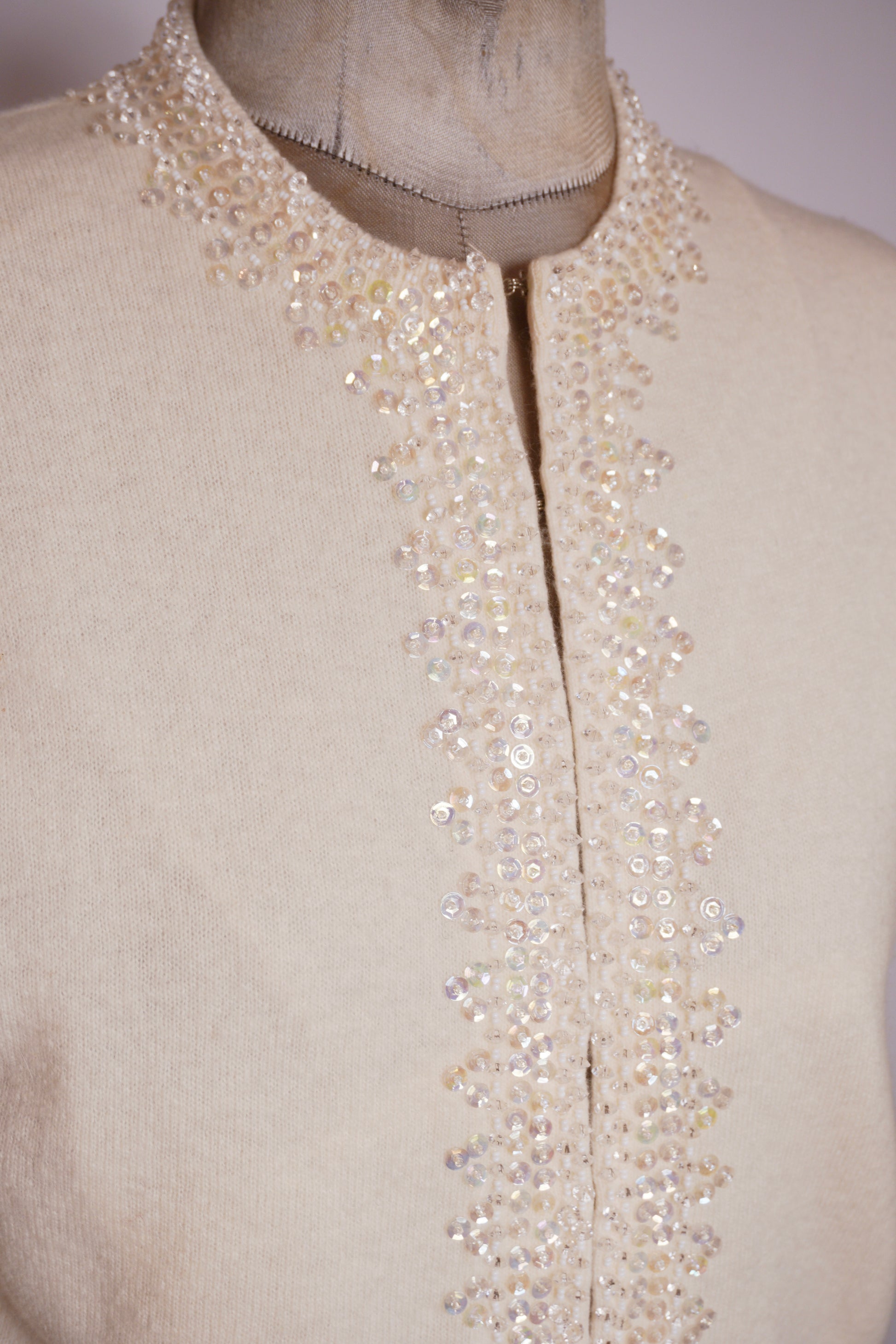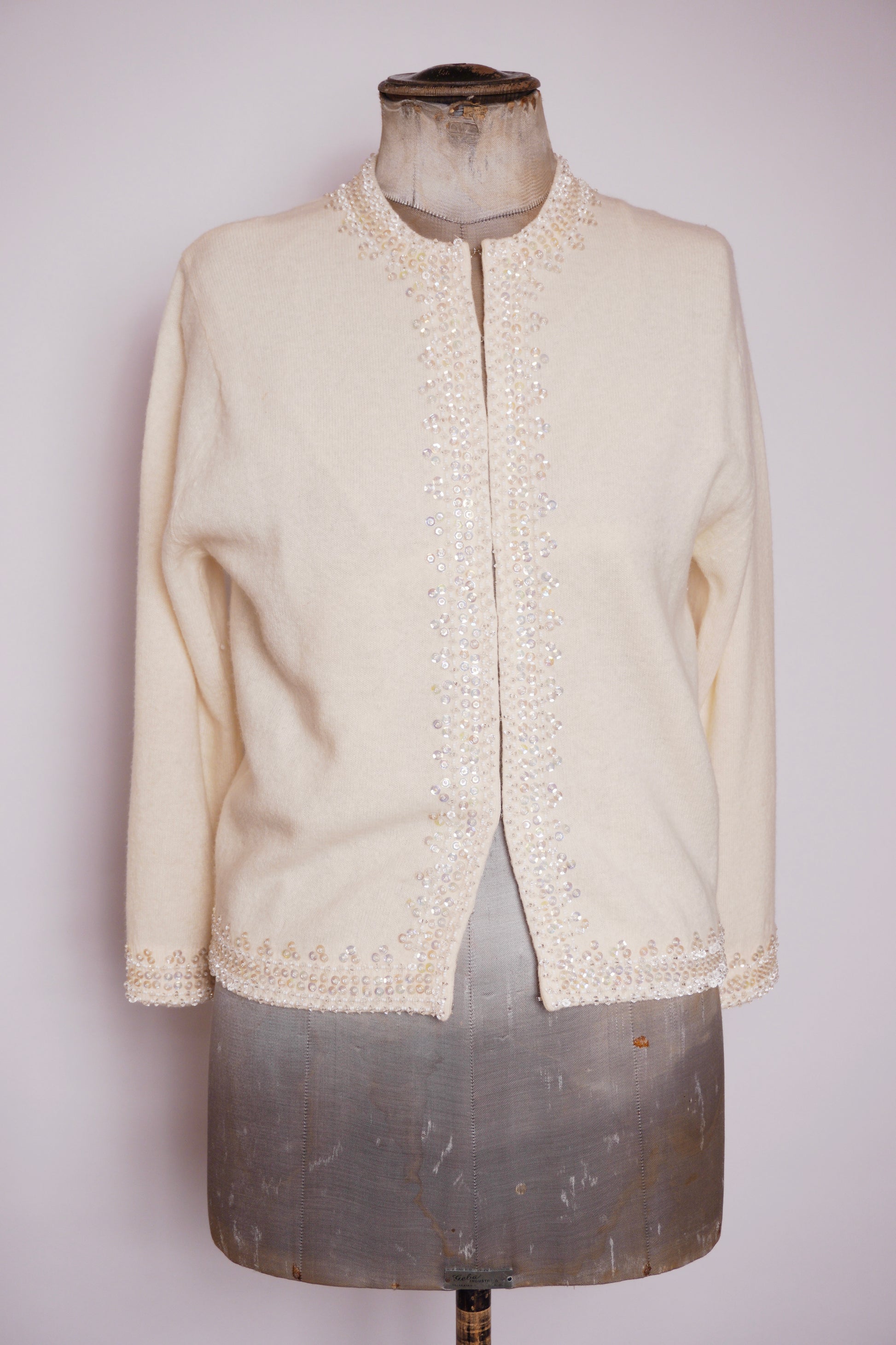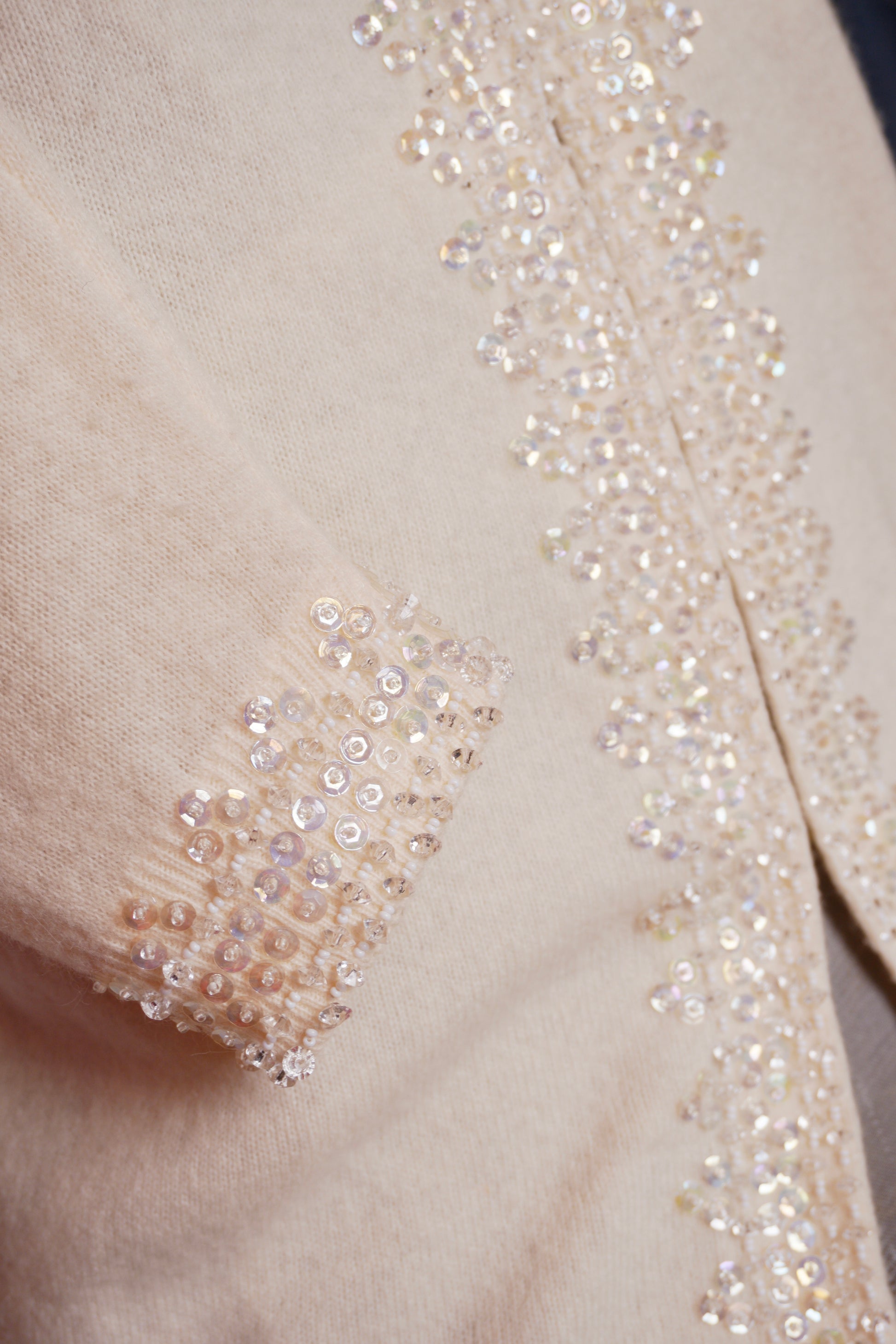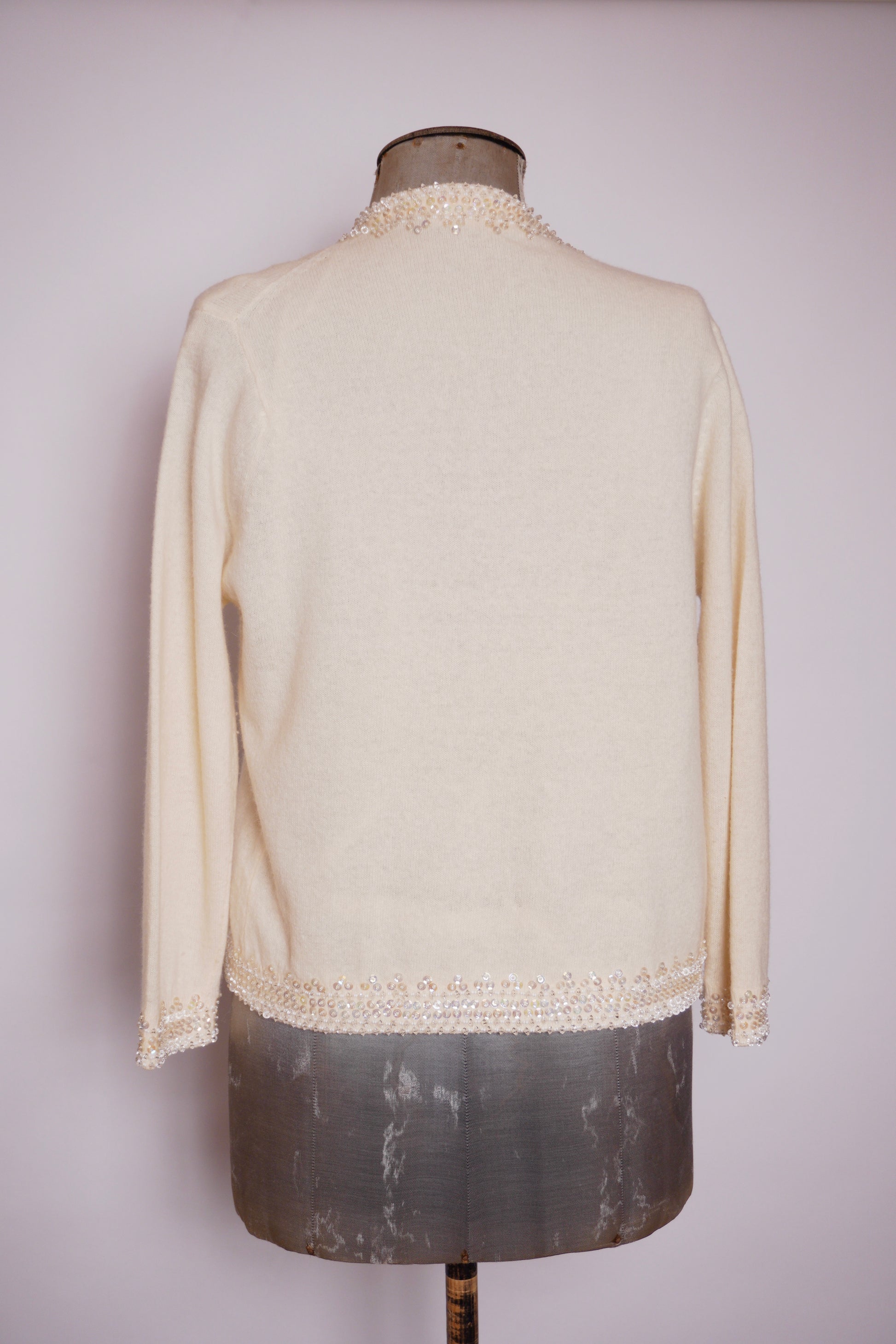 En elegant vintagekofta i mjuk angora, dekorerad med skimrande paljetter och pärldetaljer längs kanter och fåll. Den ljusa, neutrala tonen gör den lätt att matcha både till fest och vardag, medan den lyxiga materialblandningen ger en mjuk och behaglig känsla mot huden. Ett klassiskt plagg som lyfter vilken outfit som helst.