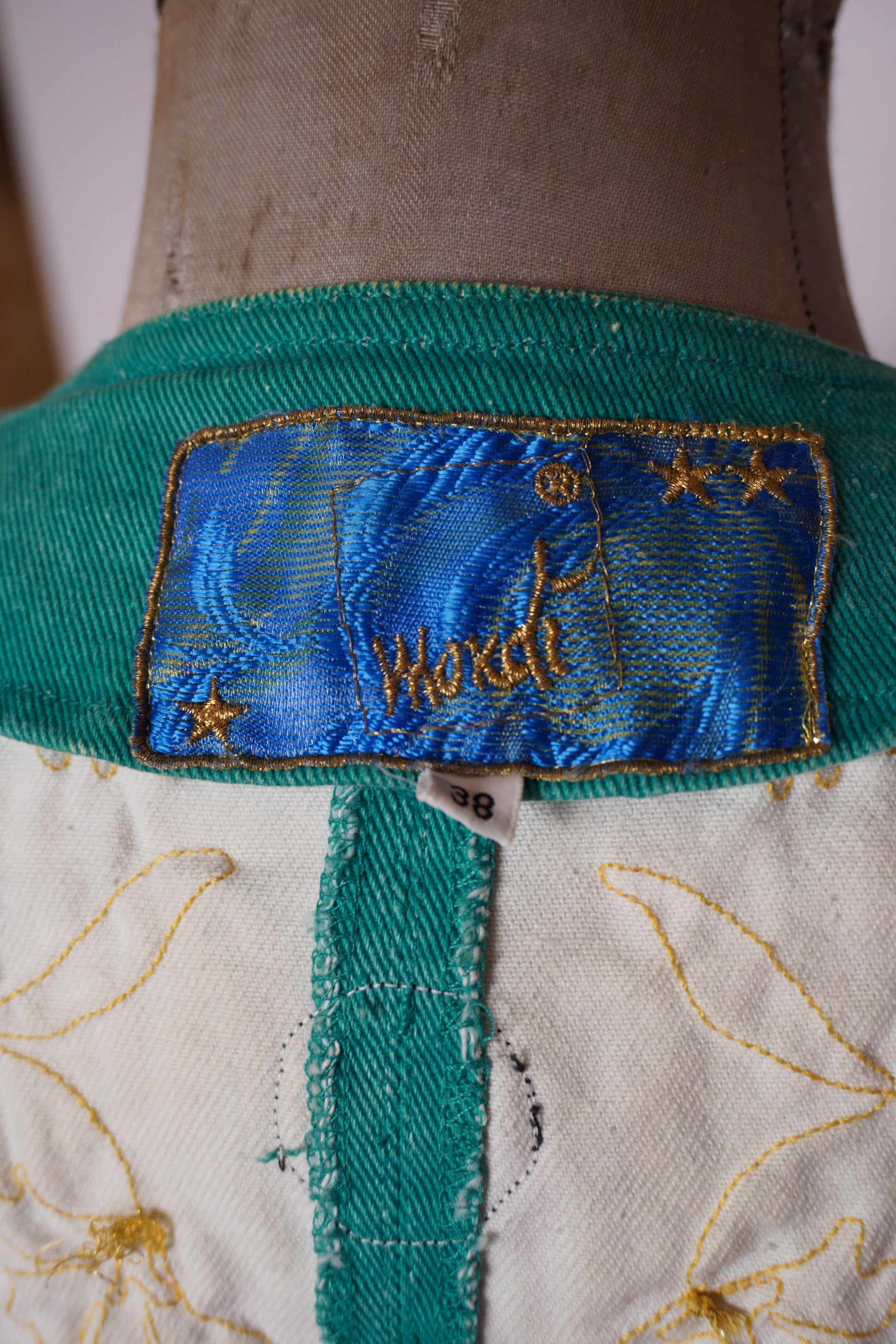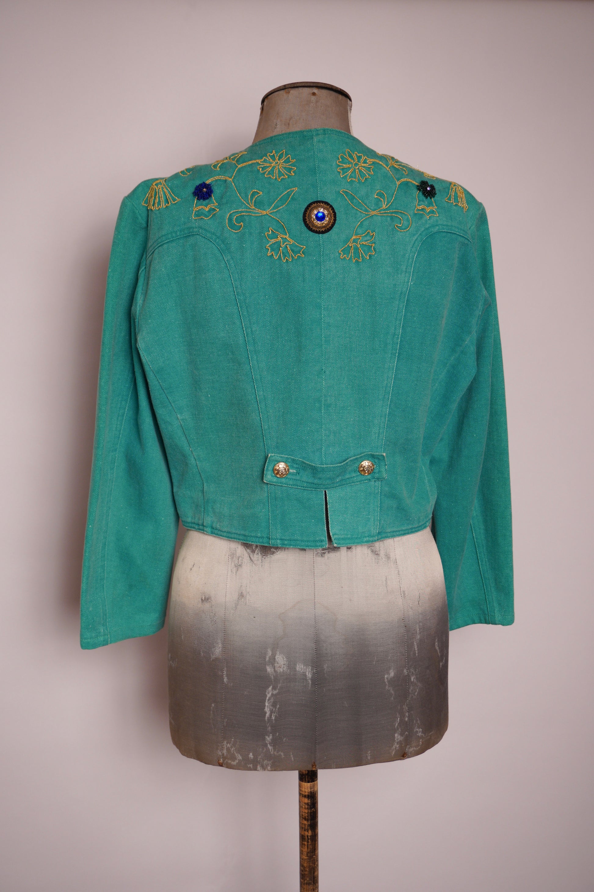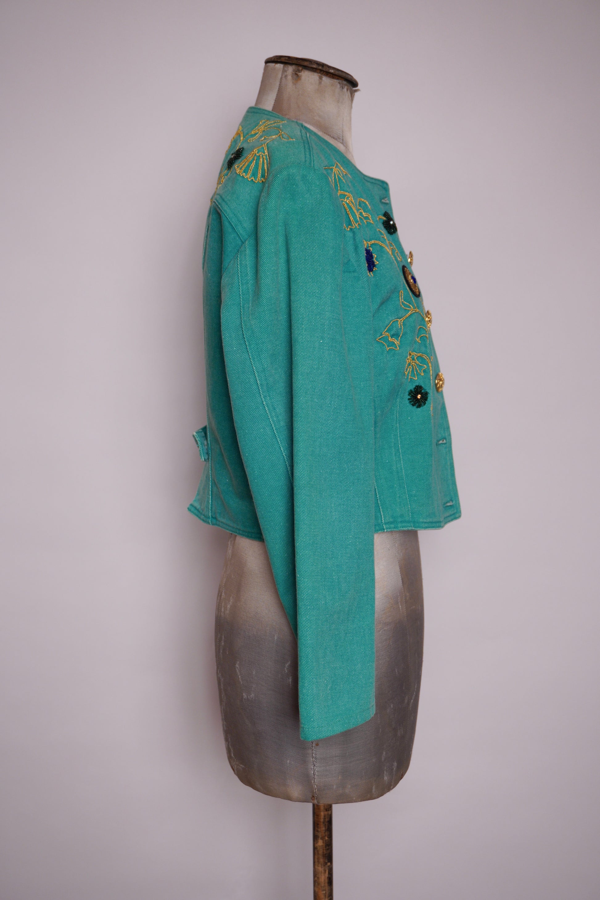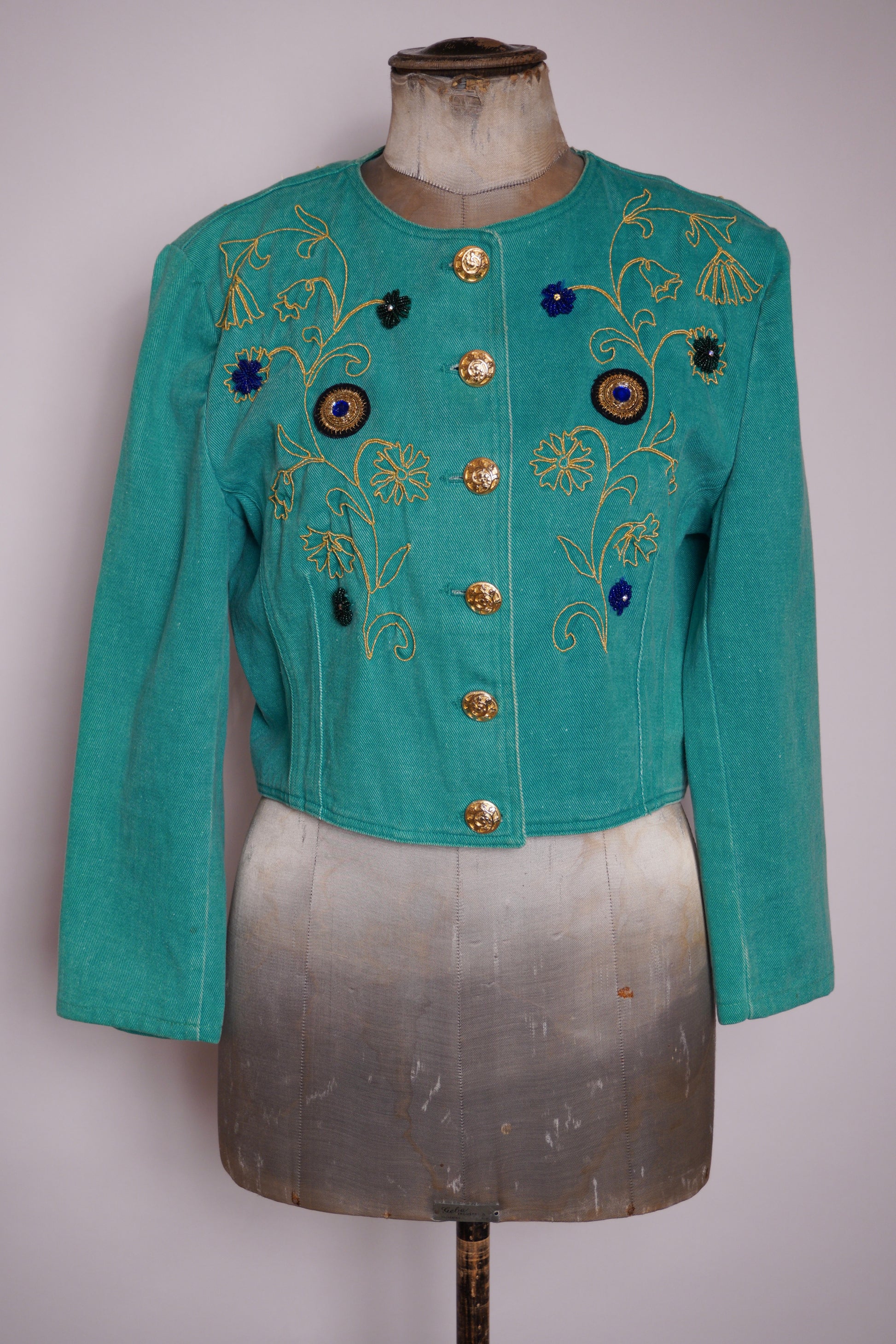 Den här jackan från Mondi är ett verkligt statement-plagg från 1980-talet, skapad för dig som vill bära något både elegant och lekfullt. Den intensiva färgen fångar blicken direkt, medan de guldbroderade blommorna och gnistrande pärldetaljerna ger en lyxig och konstnärlig känsla.