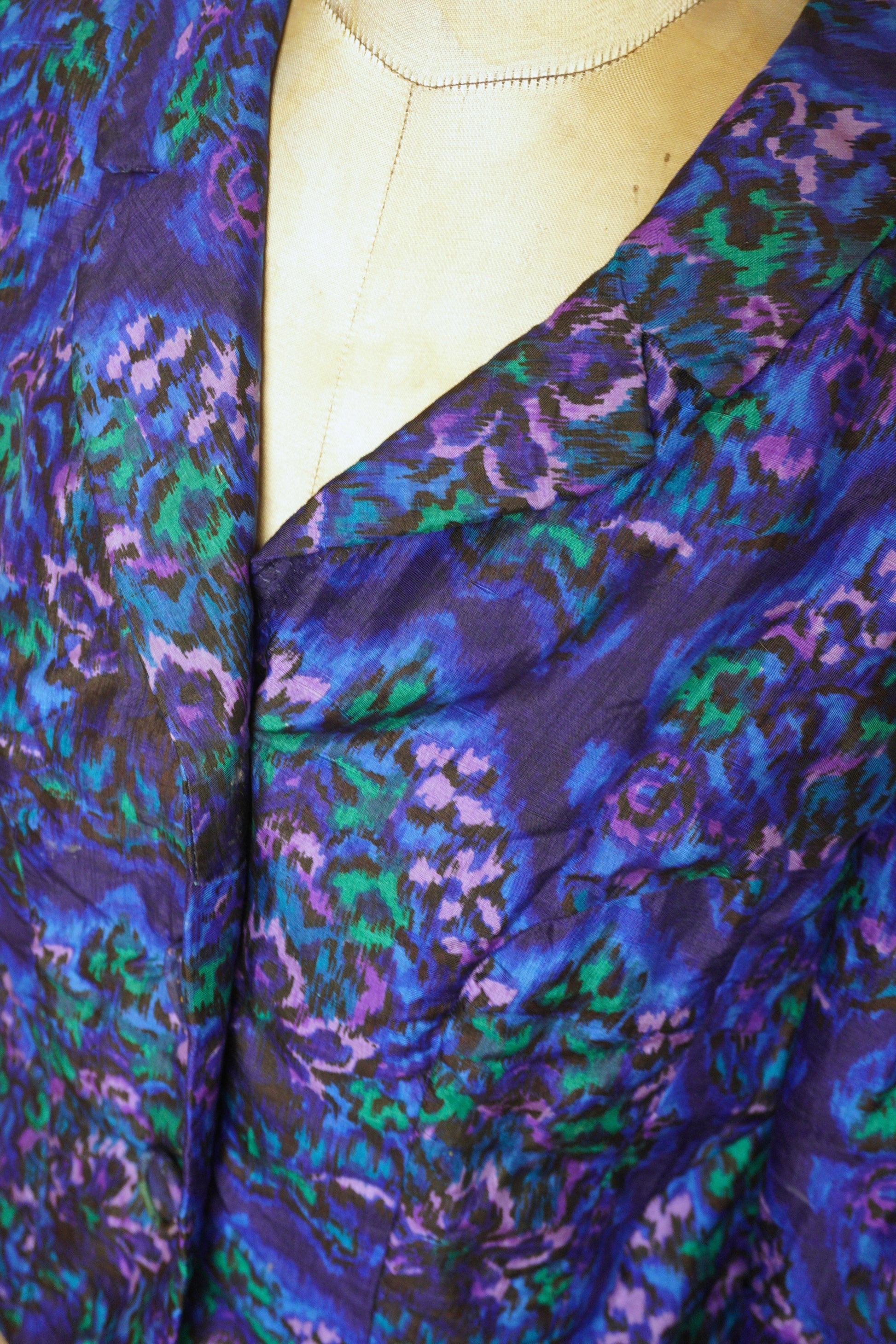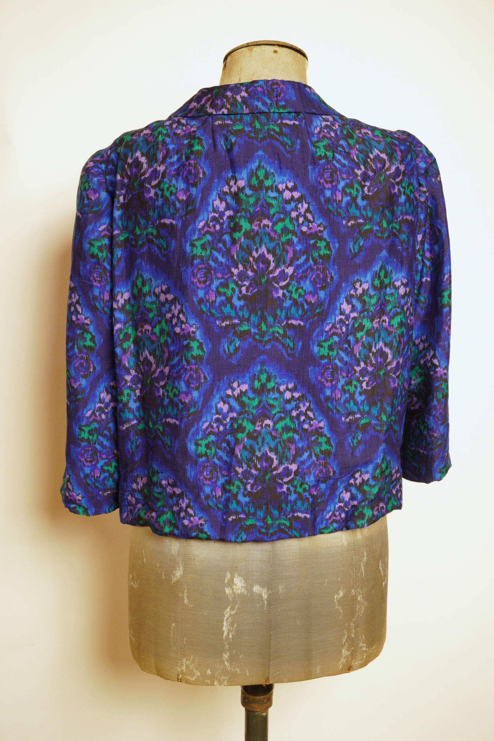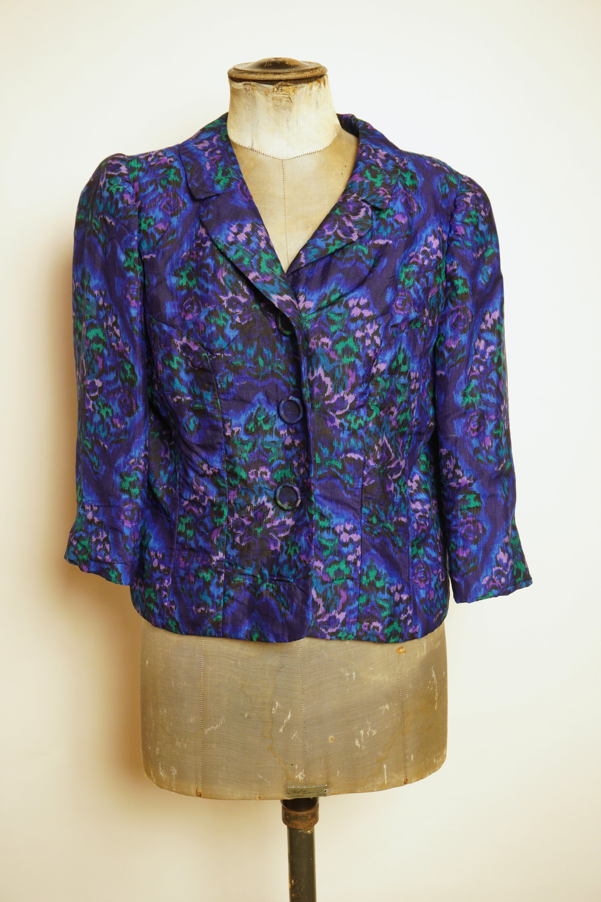 Jackan är troligen från 1960-talet, en period då Rodríguez skapade plagg med konstnärliga mönster och perfekta proportioner. Denna modell är sydd i ett lyxigt tyg med ett abstrakt blommigt mönster i djupa toner av blått, lila och grönt. Passformen är kort och figursydd med markerad midja, lätt rundade axlar och trekvartsärmar – en silhuett som utstrålar feminin elegans.