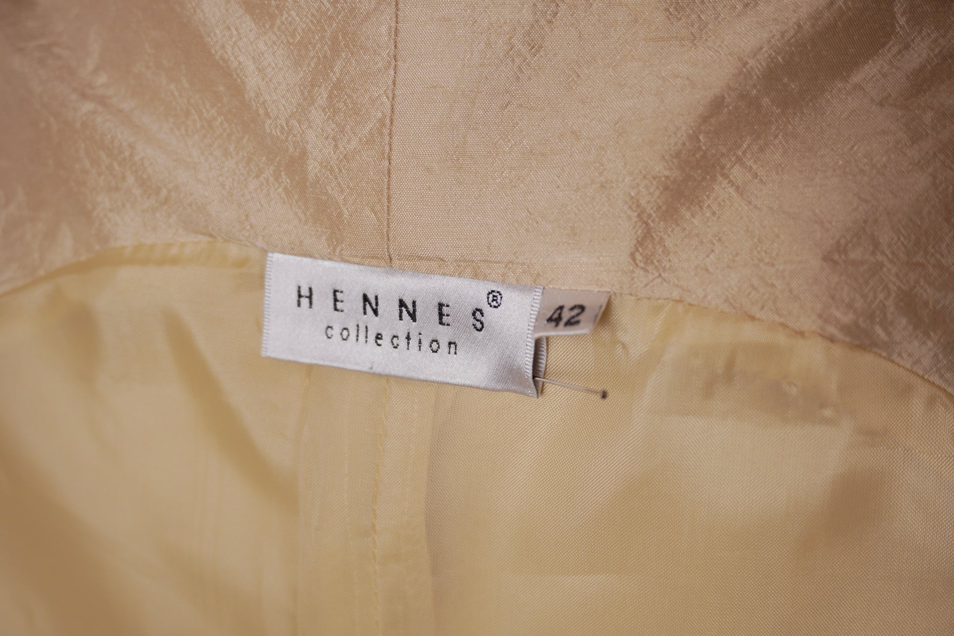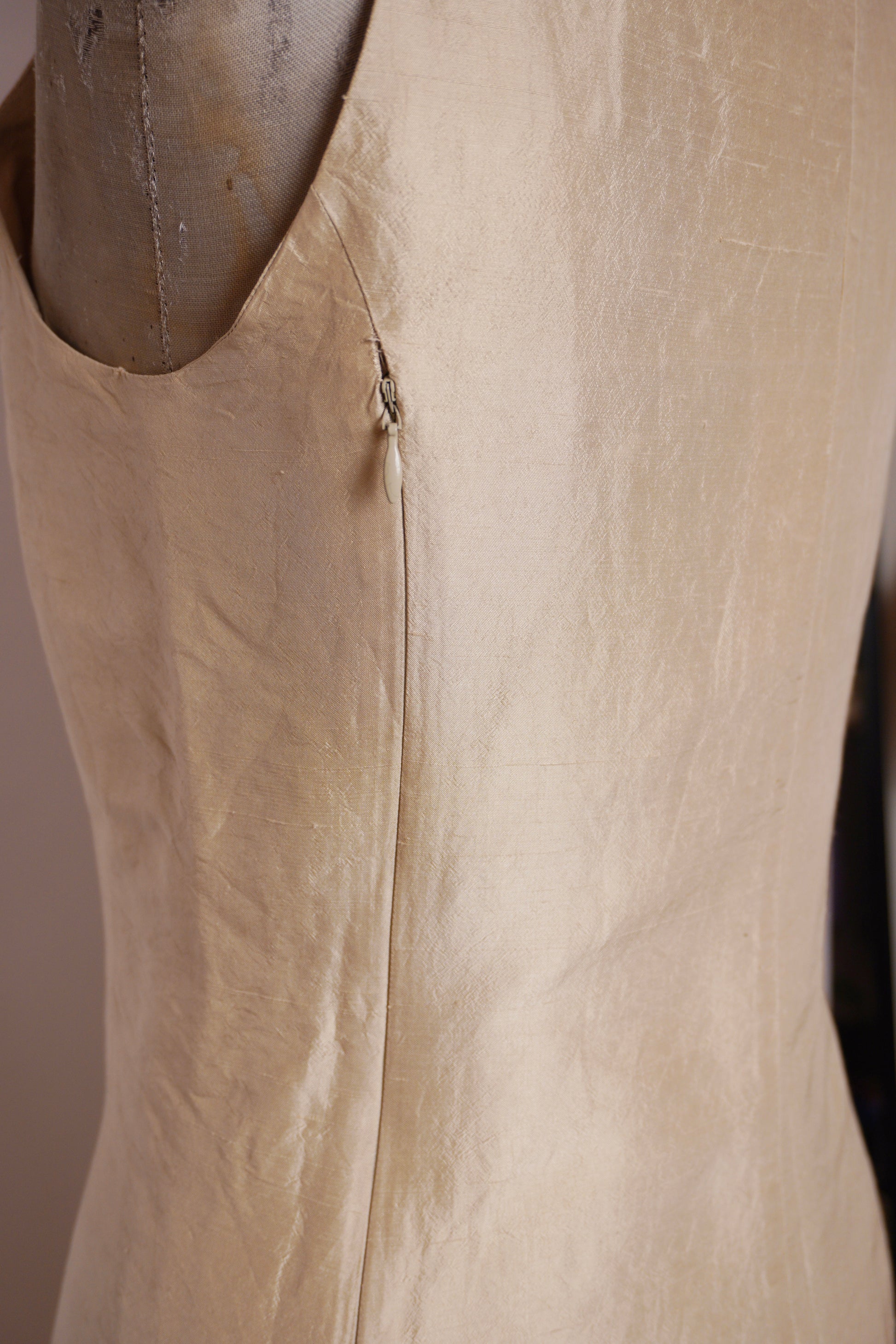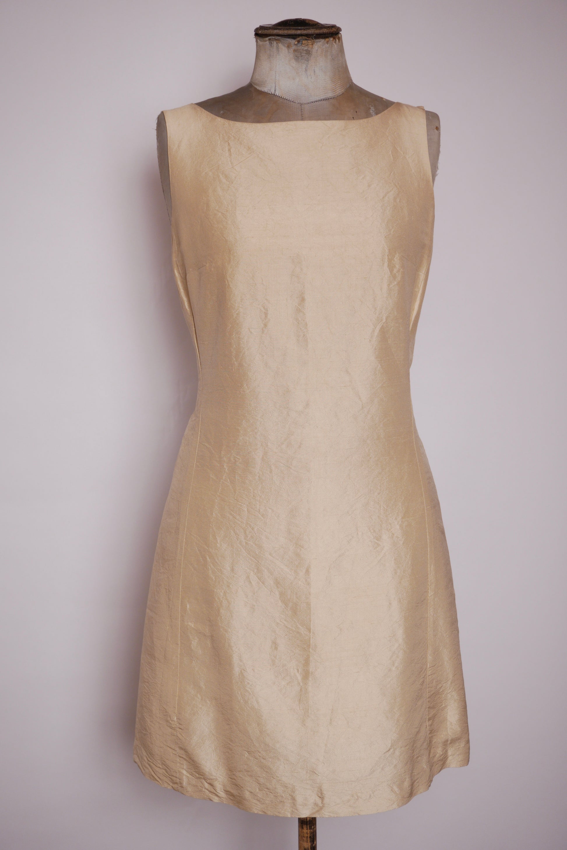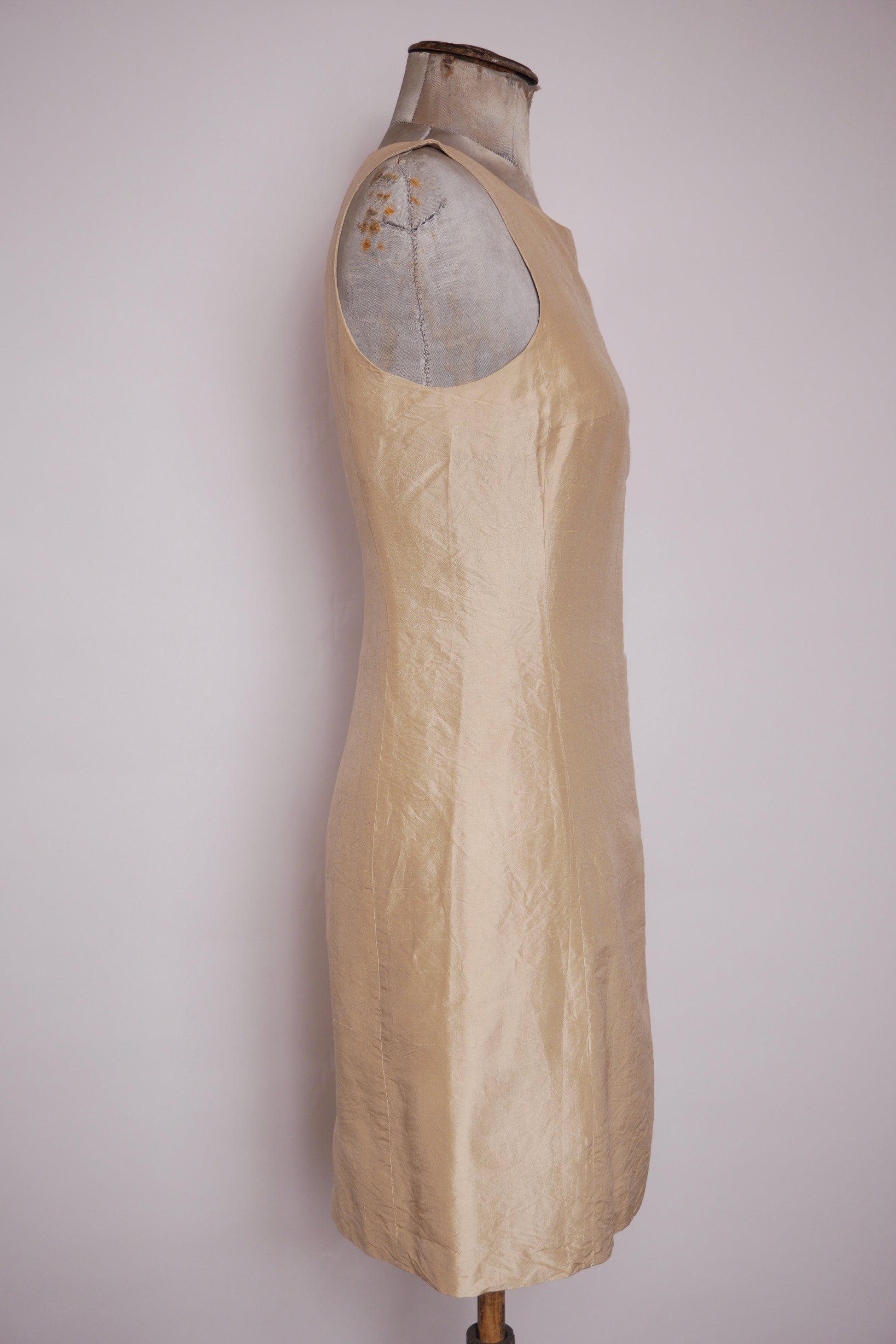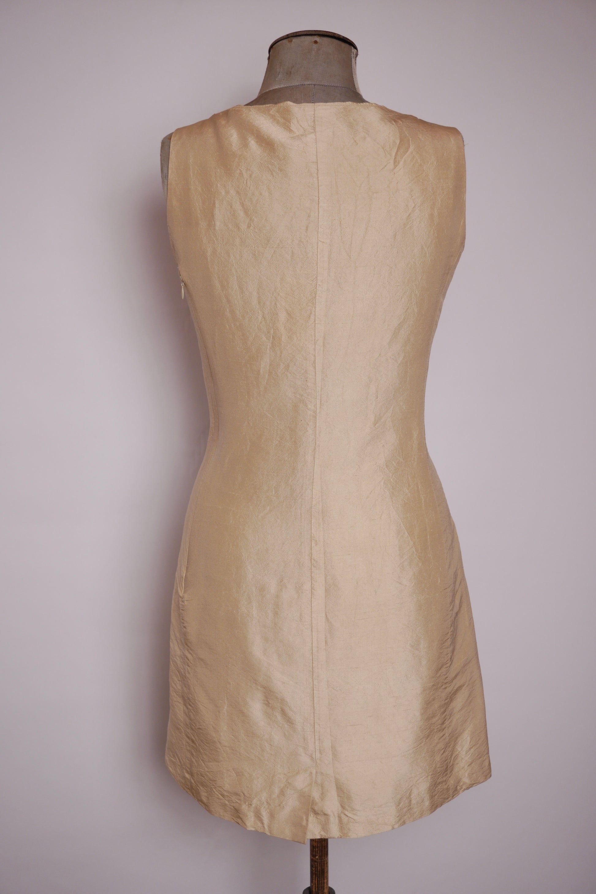 Minimalistisk klänning från H&M, tidigt 1990-tal. Modellen är enkel och sofistikerad med ärmlös silhuett och rak skärning som faller lätt mot kroppen. Tillverkad i 100% siden med en vacker, diskret lyster som ger plagget ett elegant uttryck. Den gyllene beigetonens naturliga skiftningar förstärker silkets exklusiva känsla och gör klänningen till ett tidlöst plagg som fungerar lika bra till vardags med en kavaj som till fest med smycken och klackar.