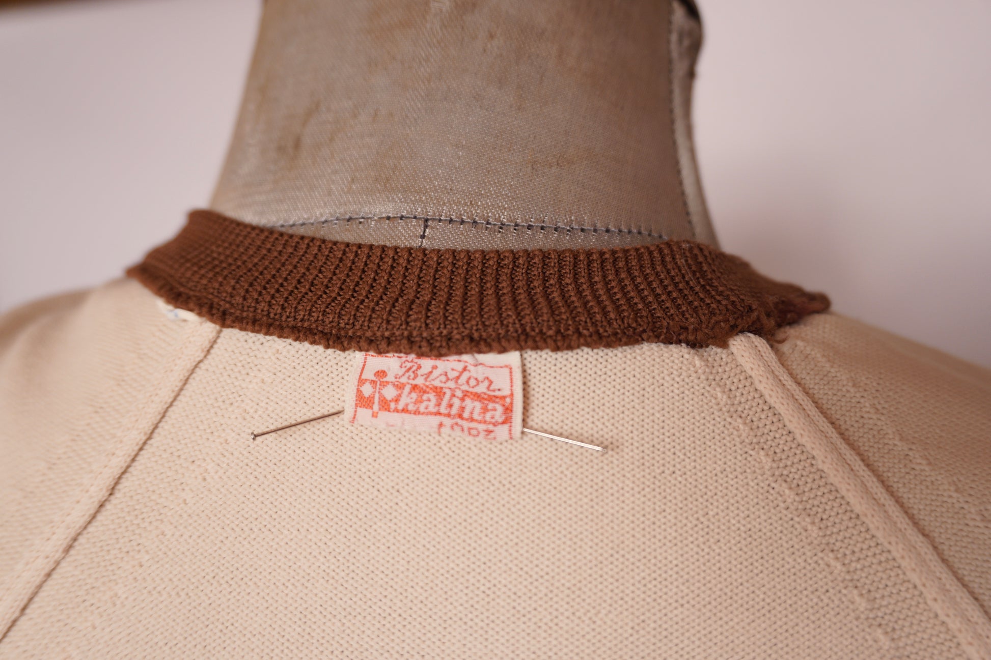 Stickad t-shirt från Bistor Kalina, ett märke som under 1970-talet specialiserade sig på vardagsplagg med sportig känsla. Modellen har kort ärm, rund halsringning och en rak passform som gör den både bekväm och tidstypisk. Färgblocken i beige, brunt och klarrött-orange ger tröjan en grafisk och lekfull karaktär – ett uttryck som är starkt förknippat med 70-talets modeideal. Ett charmigt vintageplagg som förenar enkelhet med stark färgkänsla.