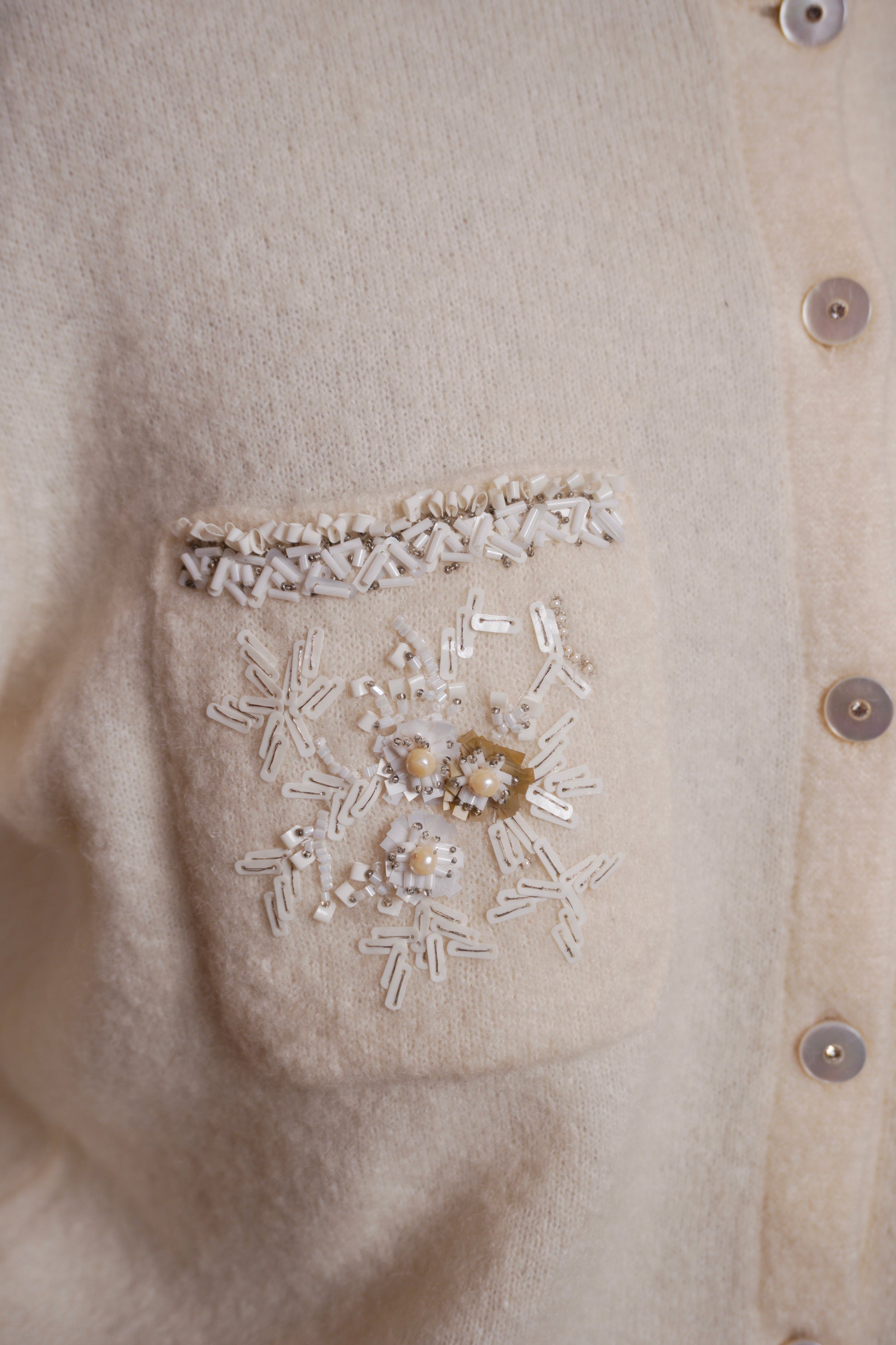 Koftan pryds av två dekorativa bröstfickor, båda smyckade med intrikata broderier i pärlor, paljetter och metallictrådar. De stilfullt arrangerade motiven ger plagget en konstnärlig touch och adderar ett diskret, men utsökt skimmer. De pärlemorskimrande knapparna framtill förstärker helheten och bidrar till koftans exklusiva känsla.
