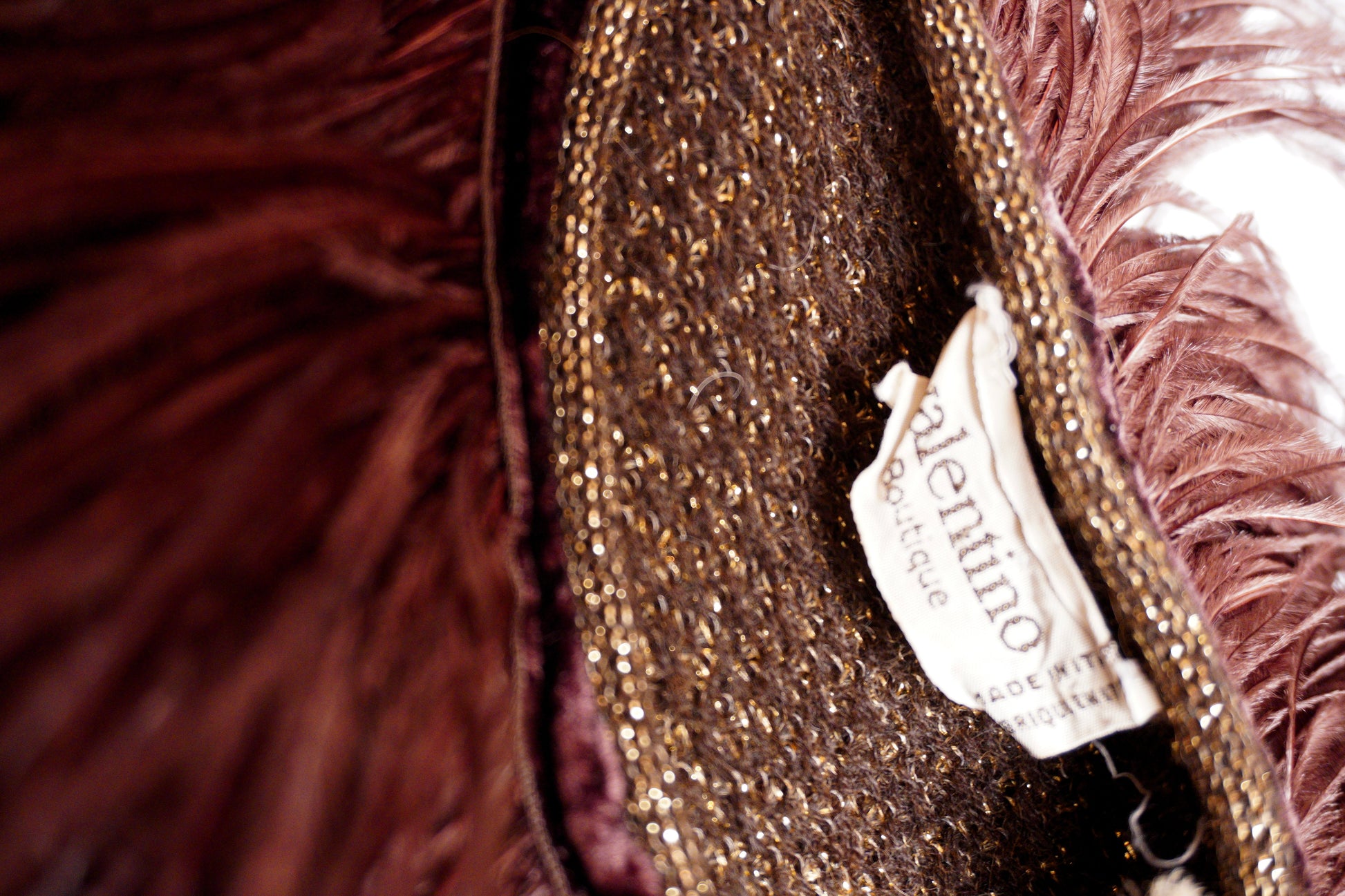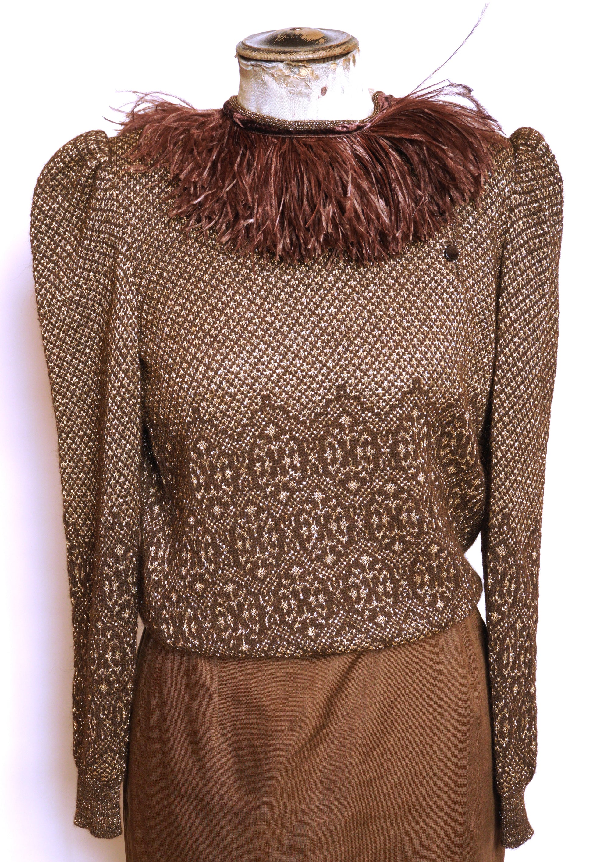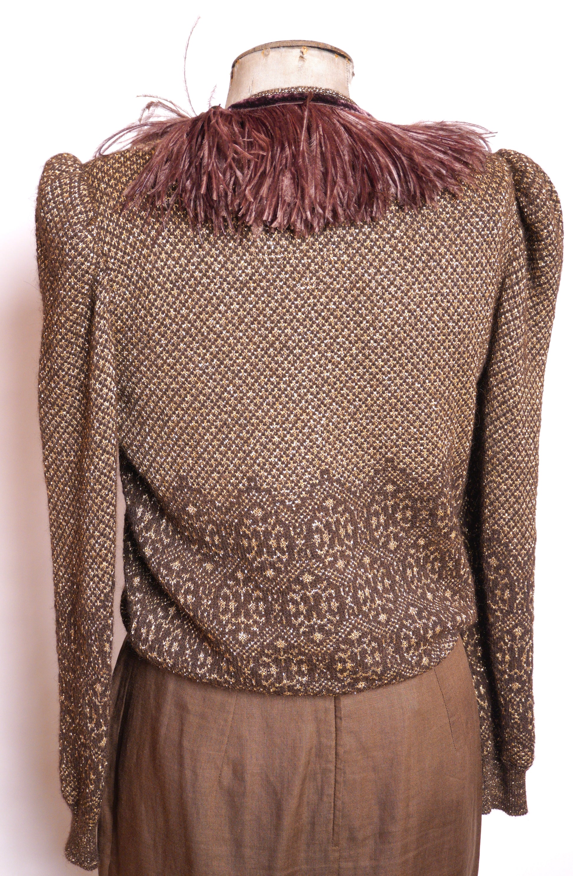 Det mest iögonfallande inslaget är den dramatiska kragen – rikt dekorerad med strutsfjädrar i en djup brun nyans som ger tröjan ett couture-likt, sceniskt uttryck. Detta skapar en fantastisk kontrast mot den mjukt strukturerade stickningen och gör tröjan till ett verkligt statement-plagg.