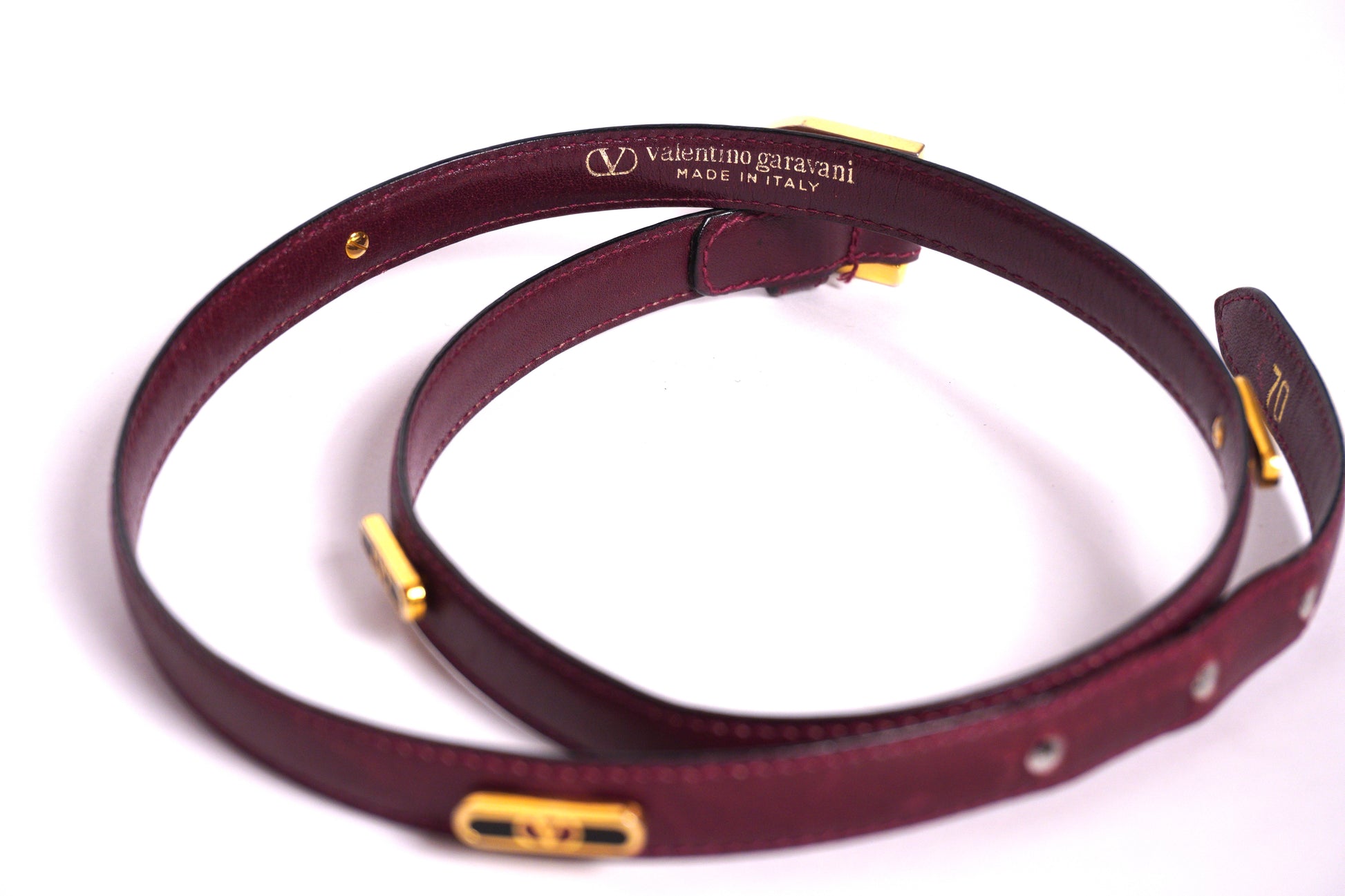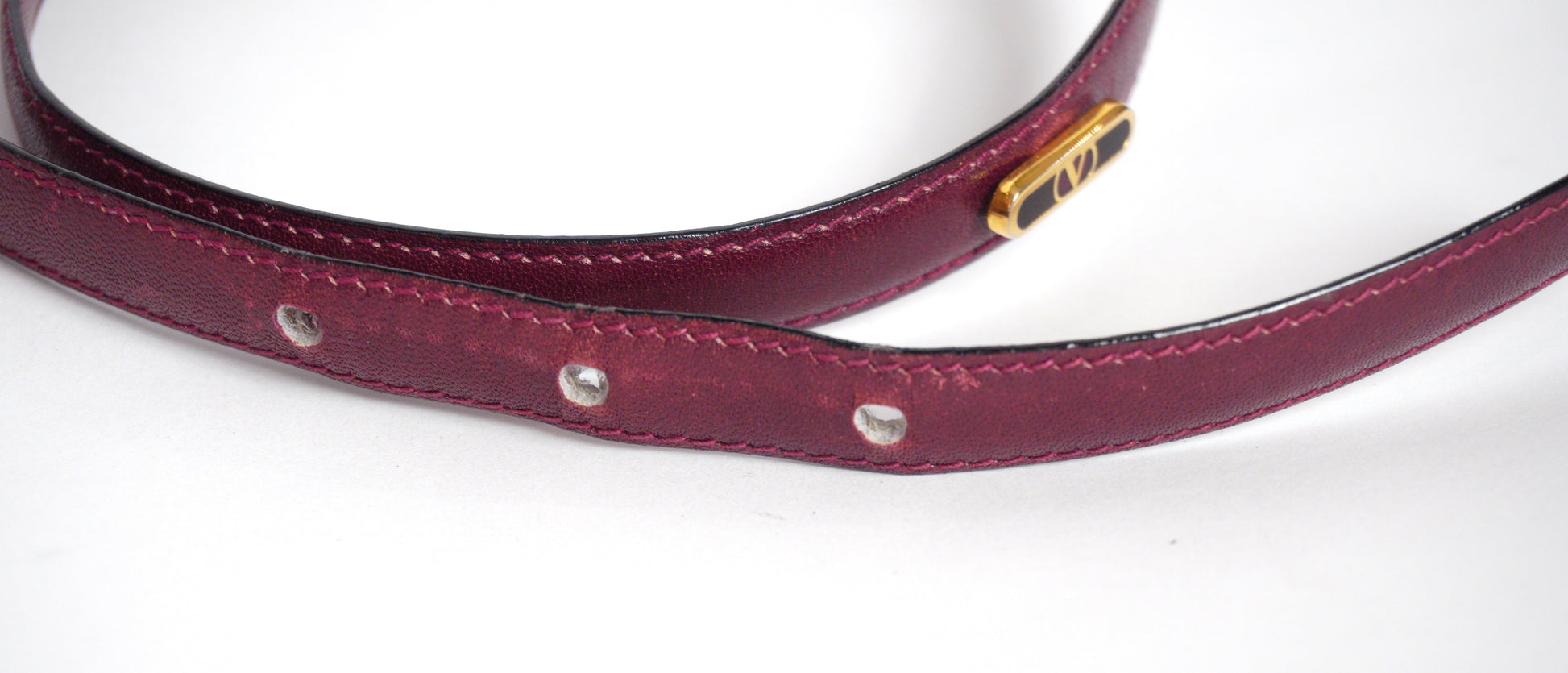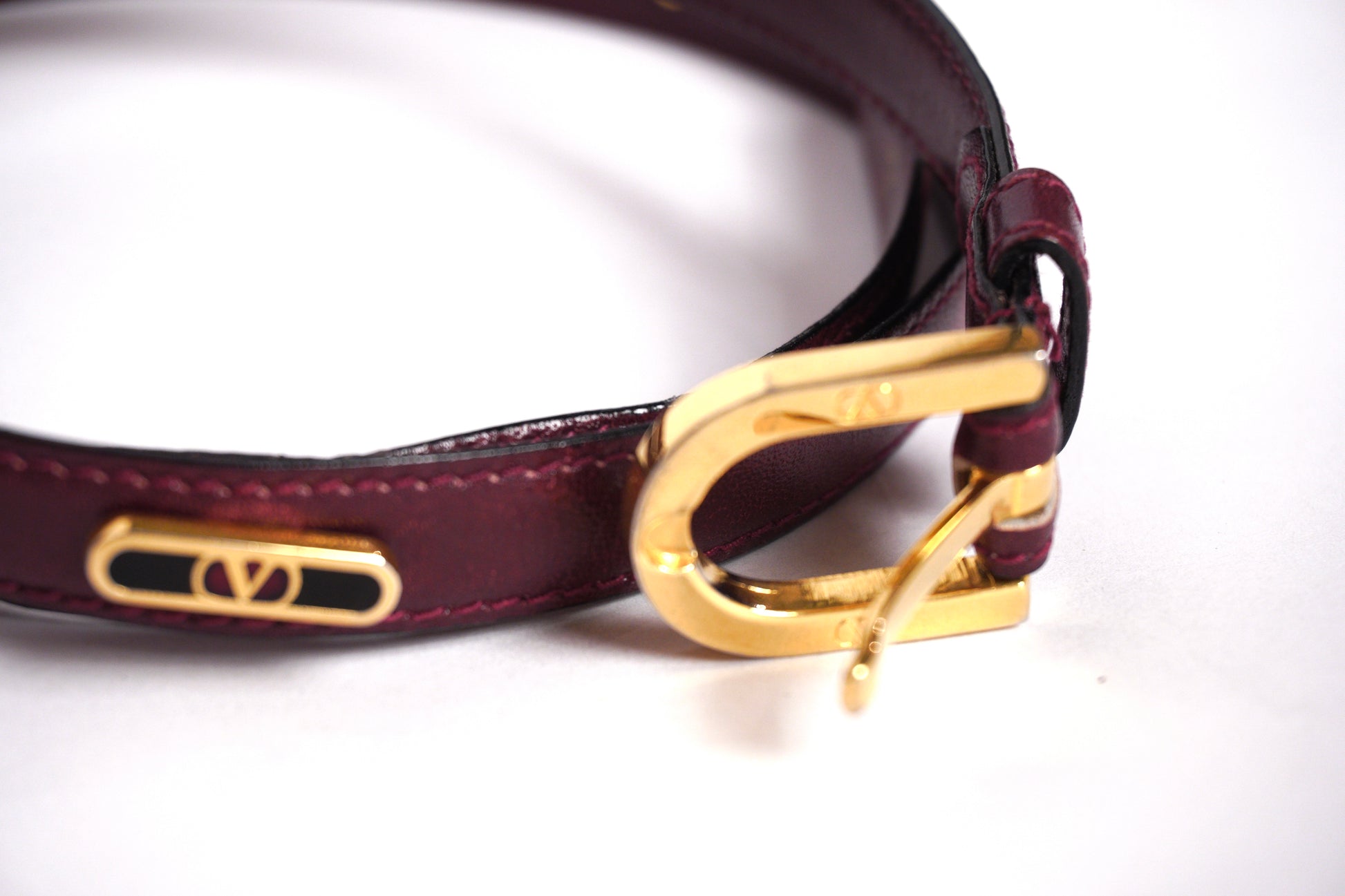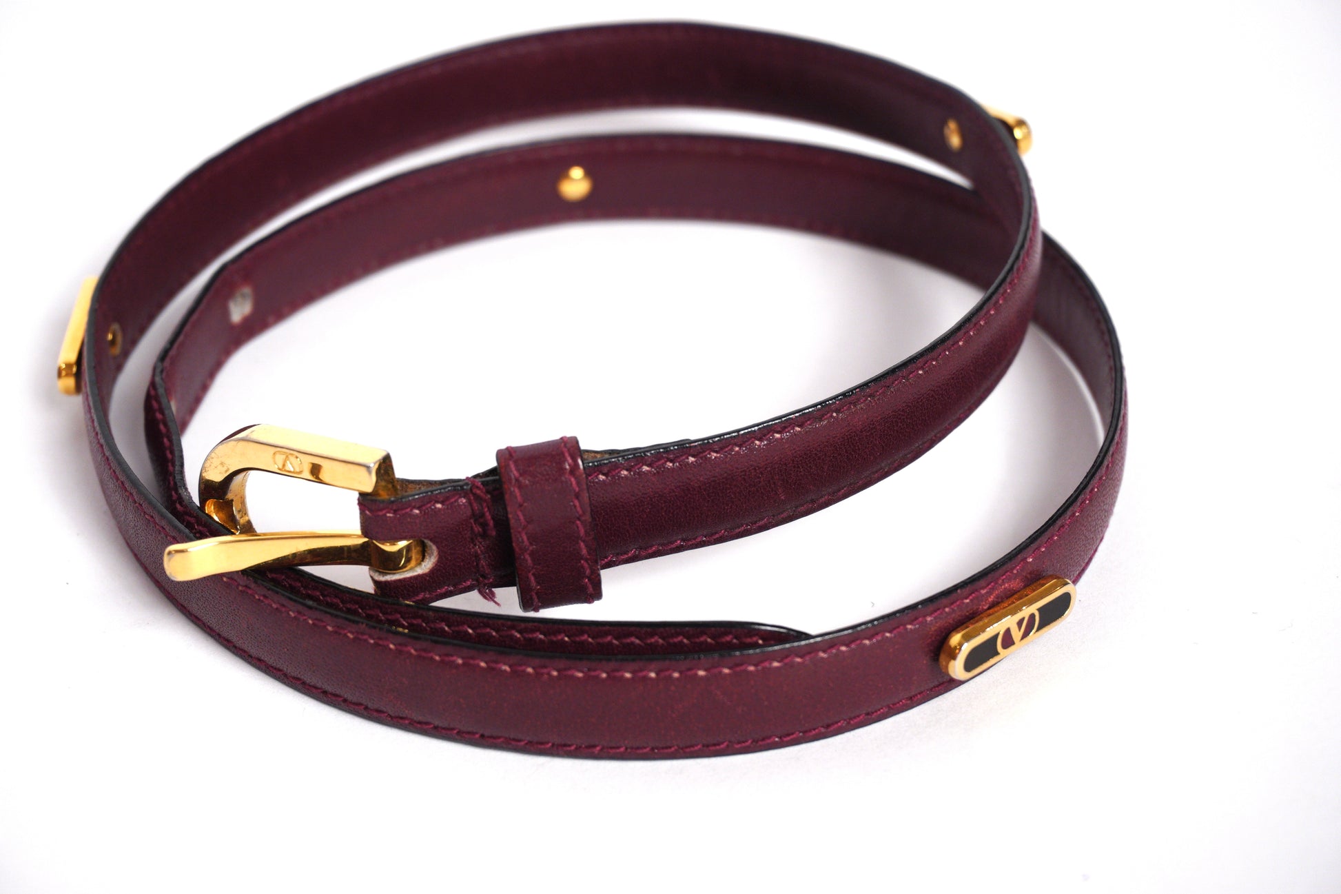 Ett smalt bälte i djup vinröd läderton, präglat av sofistikerad italiensk design och exklusiva detaljer. Bältet är tillverkat i slätt läder med fin lyster och har en klassisk smal silhuett som gör det lika användbart till byxor som till klänning eller kavaj. De guldfärgade metalldetaljerna, inklusive det ikoniska ovala Valentino-emblemet, ger ett diskret men omisskännligt uttryck av lyx.