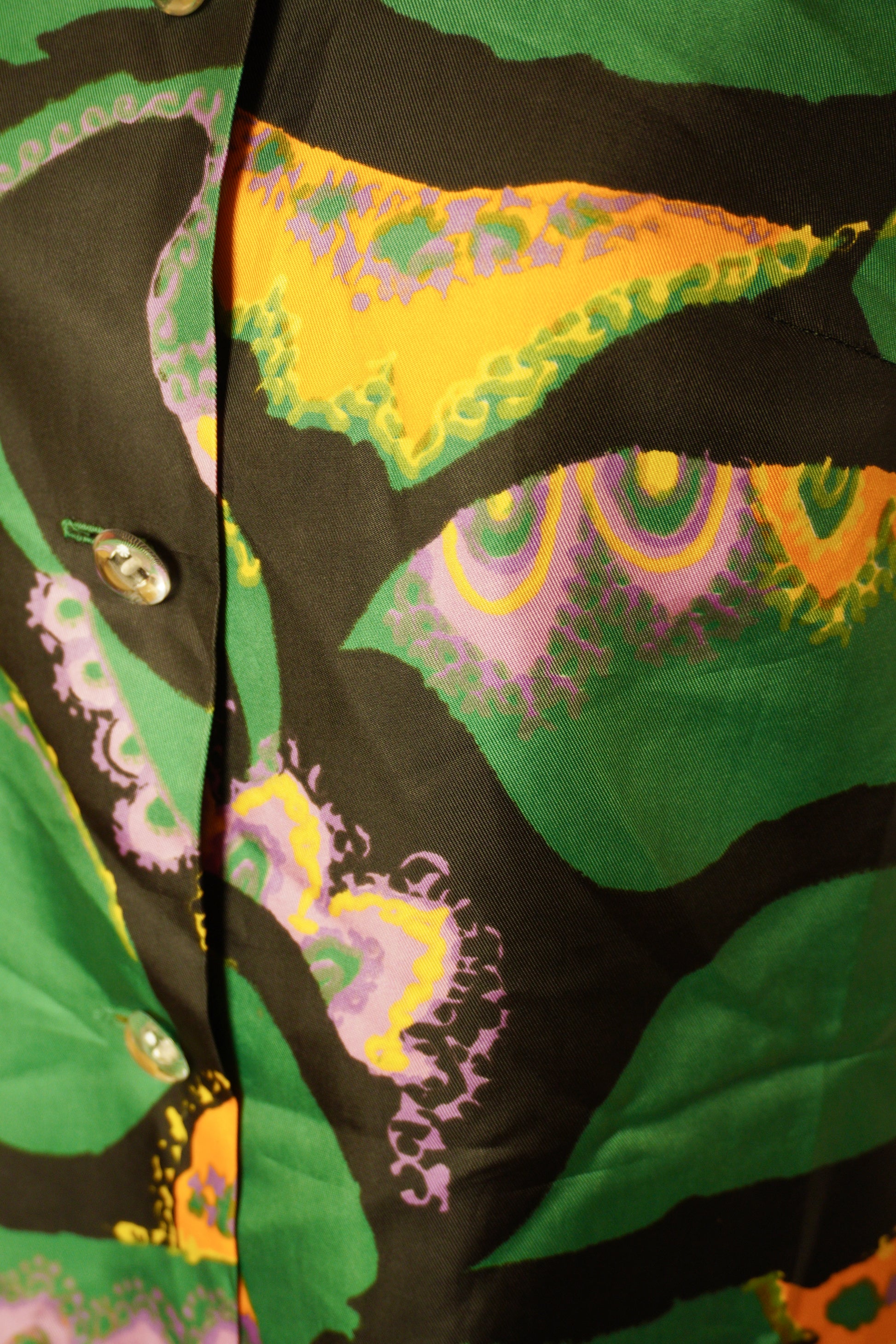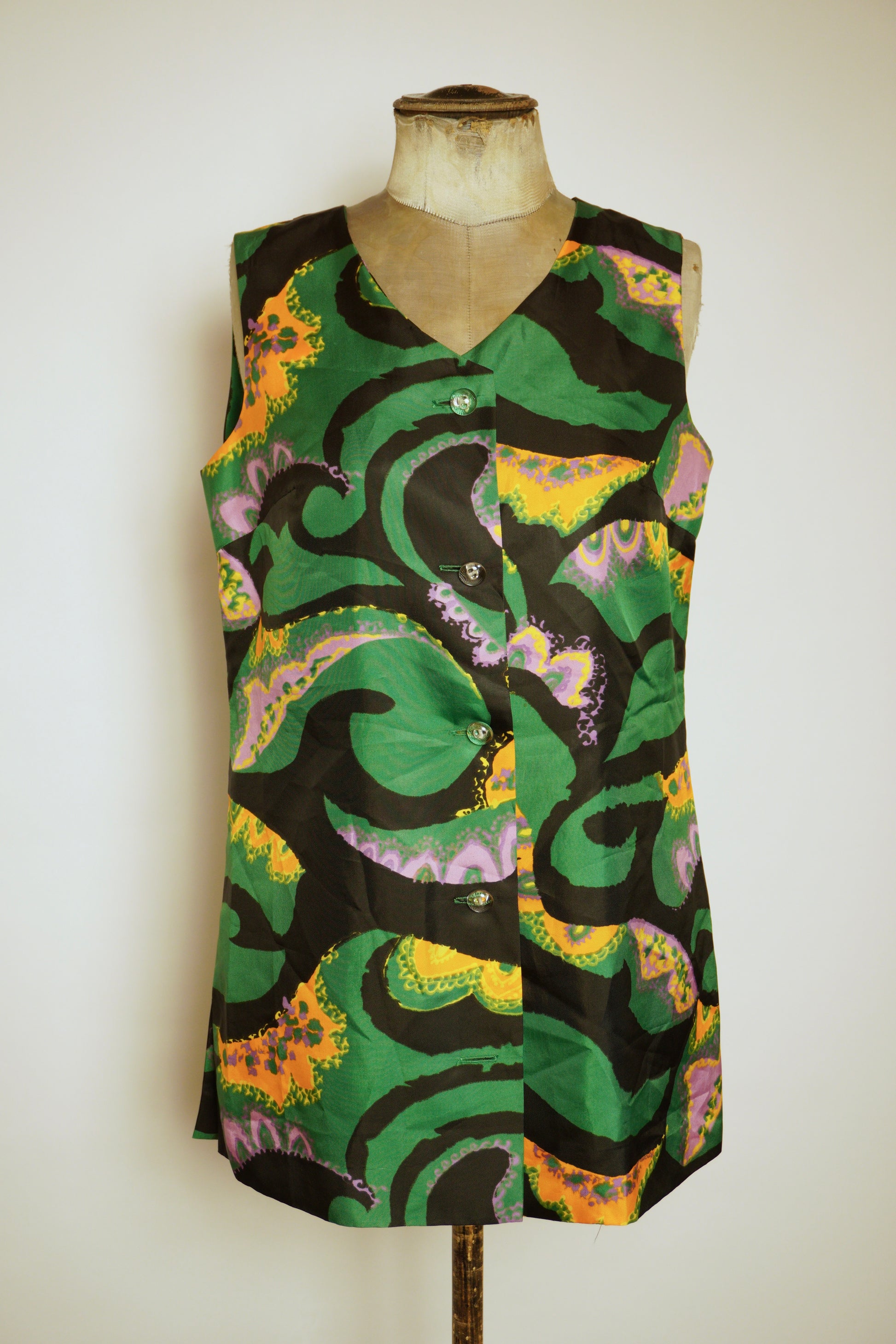 Den här färgstarka västen är ett riktigt unikt vintagefynd från Rubensons Stockholm, tillverkad i Sverige. Med sitt abstrakta, nästan psykedeliska mönster, andas den starkt 1960-talets och 1970-talets lekfulla estetik. Västen är ärmlös, knäppt framtill med gröna knappar och har en rak, lite längre silhuett som gör den både snygg att bära över en polotröja eller som ett statement-plagg i sig.