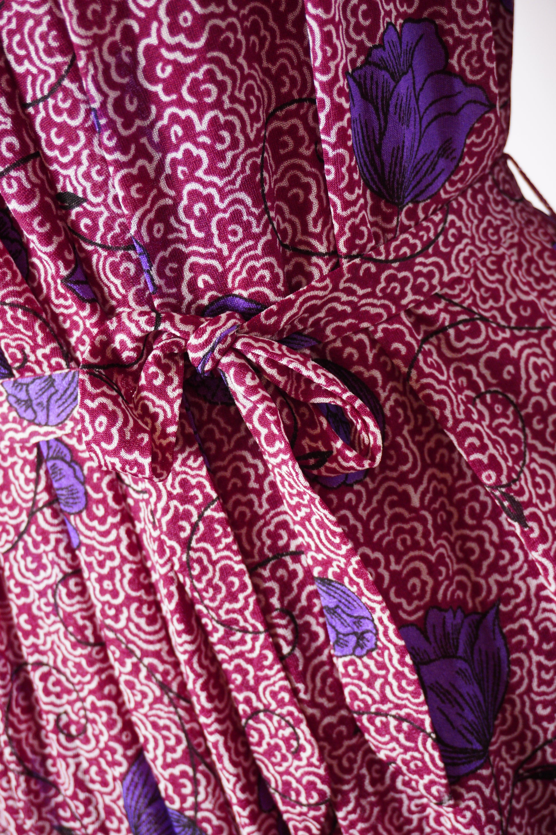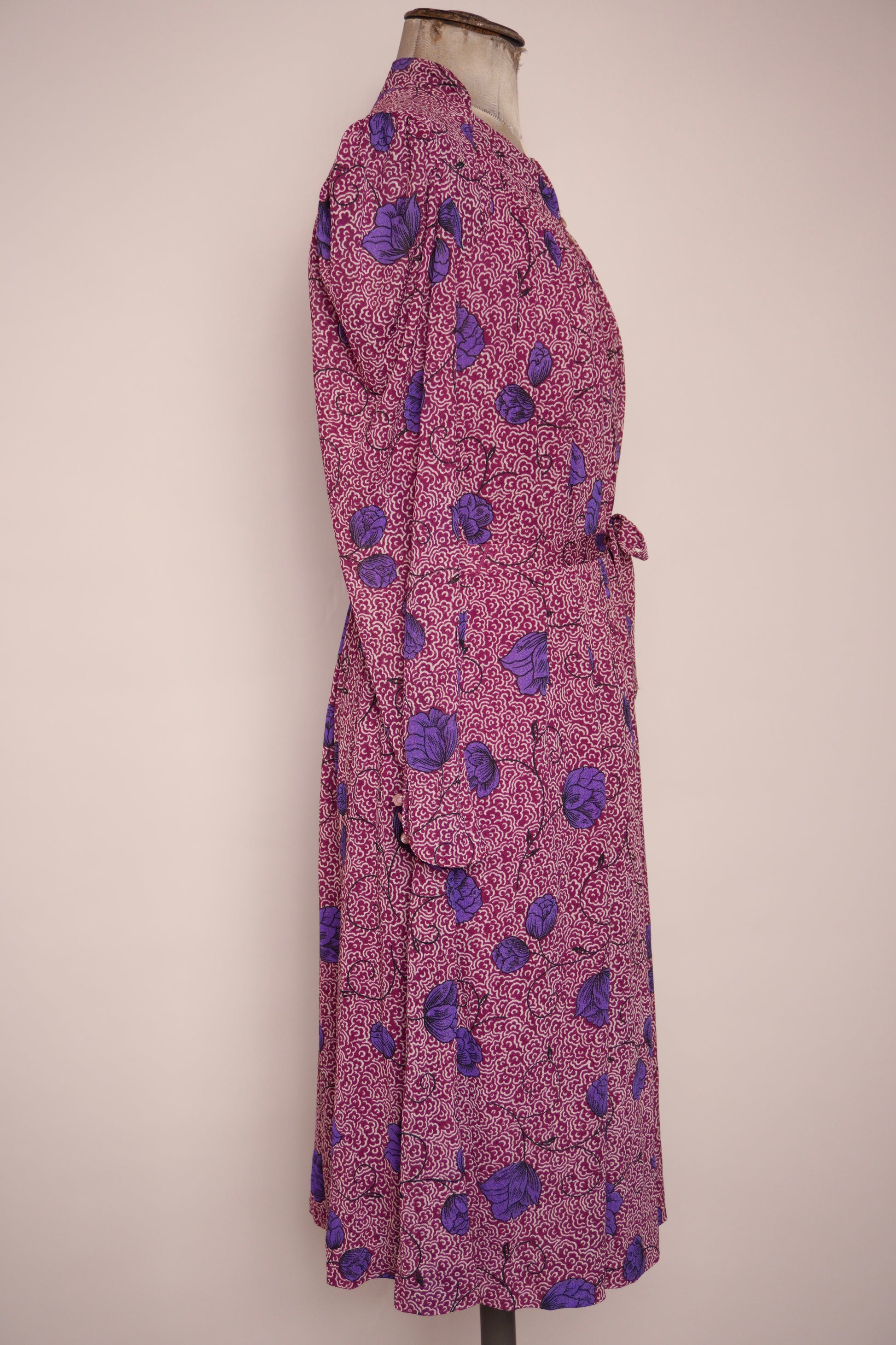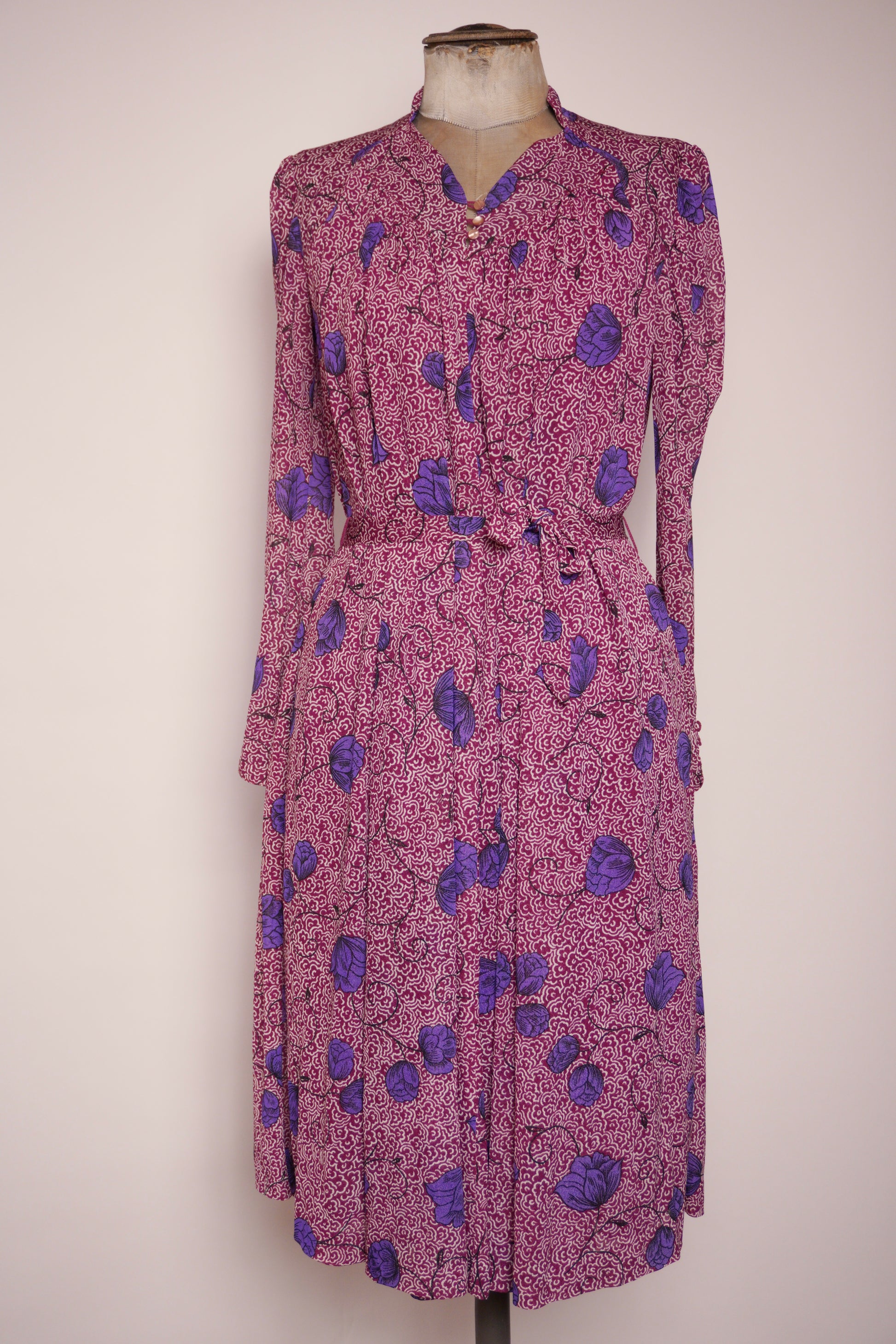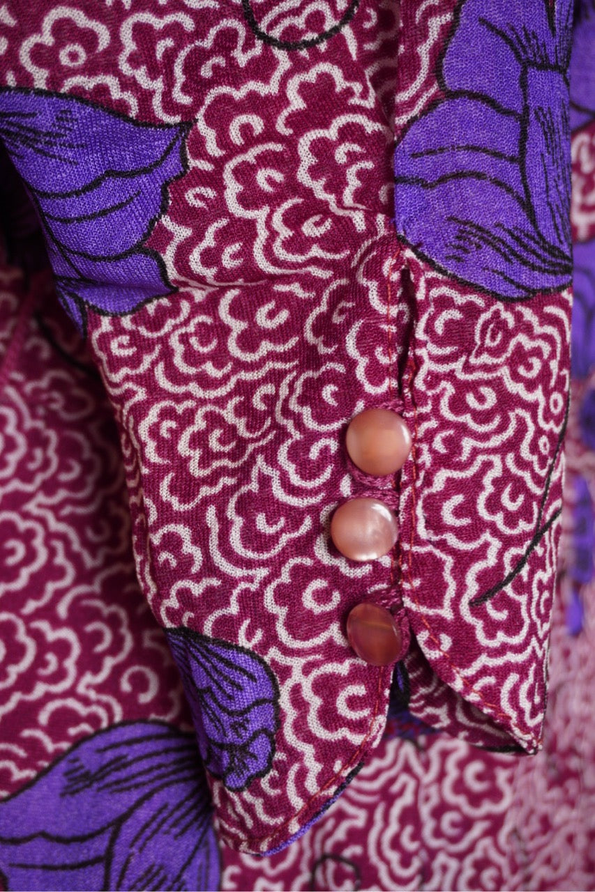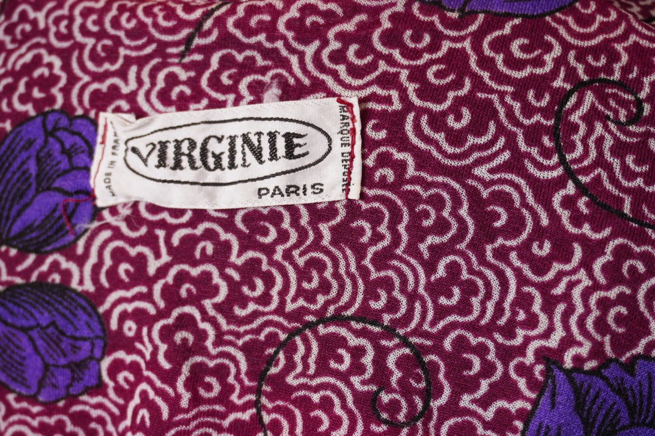 Elegant klänning från Virginie, sannolikt 1980-tal. Mönstret kombinerar en livlig vinröd botten med stiliserade blommor i lila och blå toner – ett uttrycksfullt och tidstypiskt tryck. Modellen har långa ärmar, markerad midja med knytskärp och en mjukt fallande kjol som ger en smickrande siluett. Den lilla ståkragen med knappdetalj framtill adderar en sofistikerad känsla. Ett vackert vintageplagg som fungerar lika bra till vardags som till fest.